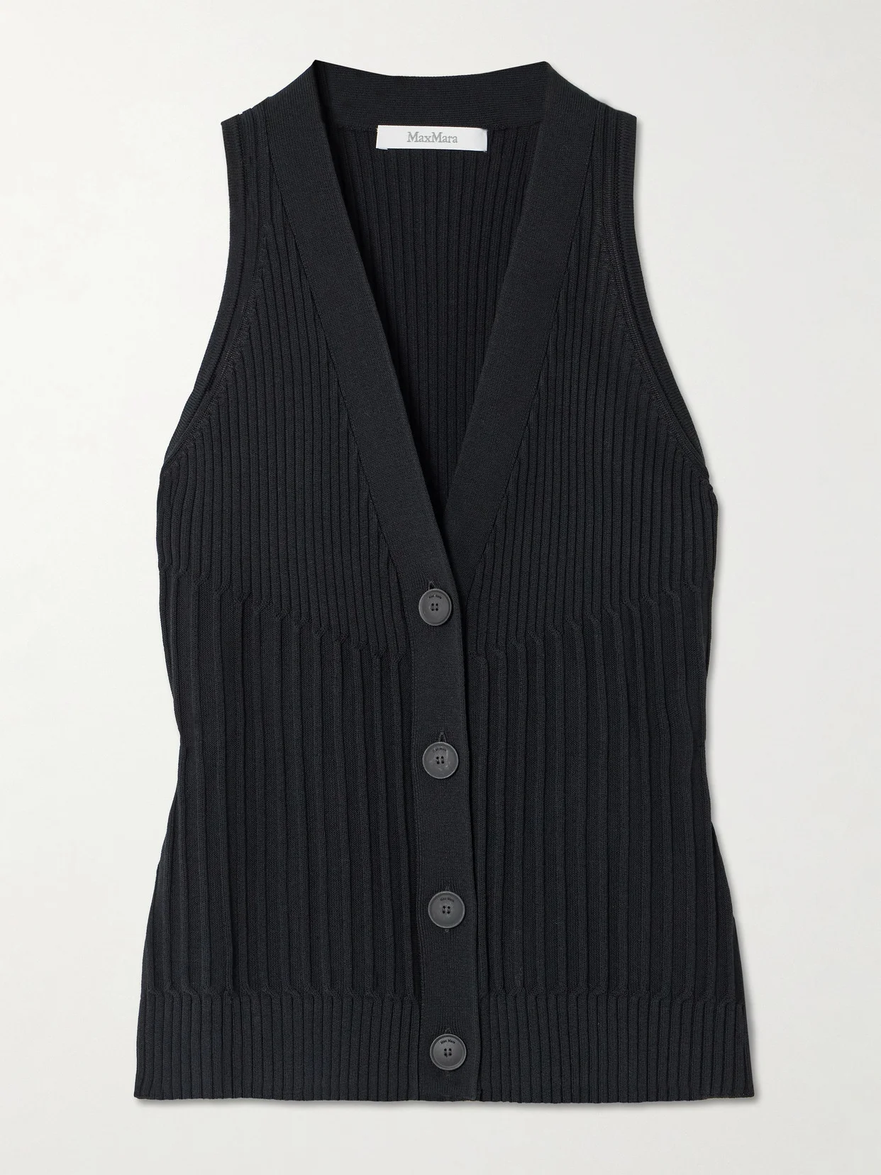 Max Mara's 'Bimba' vest blends the look of classic tailoring with the comfort of your favorite sweater. Knitted from soft cotton-blend using a neat ribbed stitch, it has a close fit and deep V-neckline. Wear yours with tonal pants and stacks of bracelets.