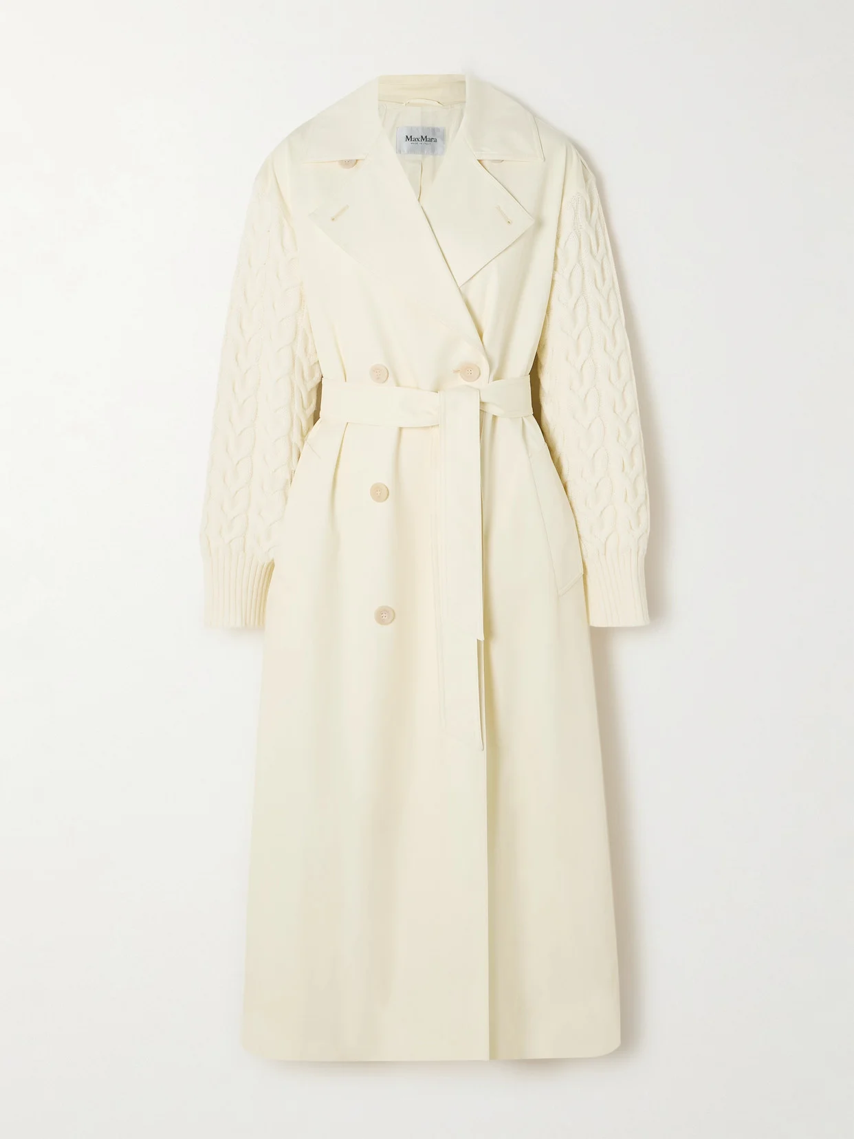 Artful and playful, Max Mara's 'Cicladi' coat is offset with cable-knit sleeves that also feel wonderfully warm. The body is tailored from water-repellent wool and cotton-blend gabardine with all the classic touches of a trench.
