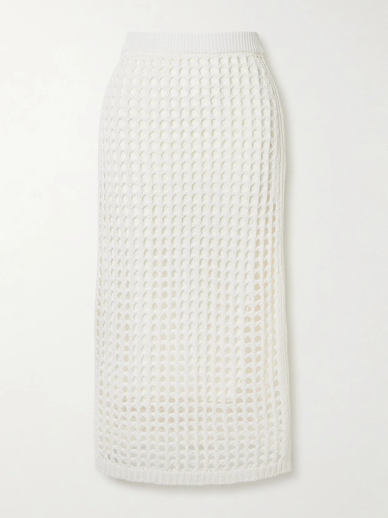 Max Mara's 'MXPGEODE' skirt reinterprets classic tailoring through a modern lens. Made in Italy from cotton, it features a square-cut openwork overlay and is cut to a midi length. Style yours with an oversized blazer.