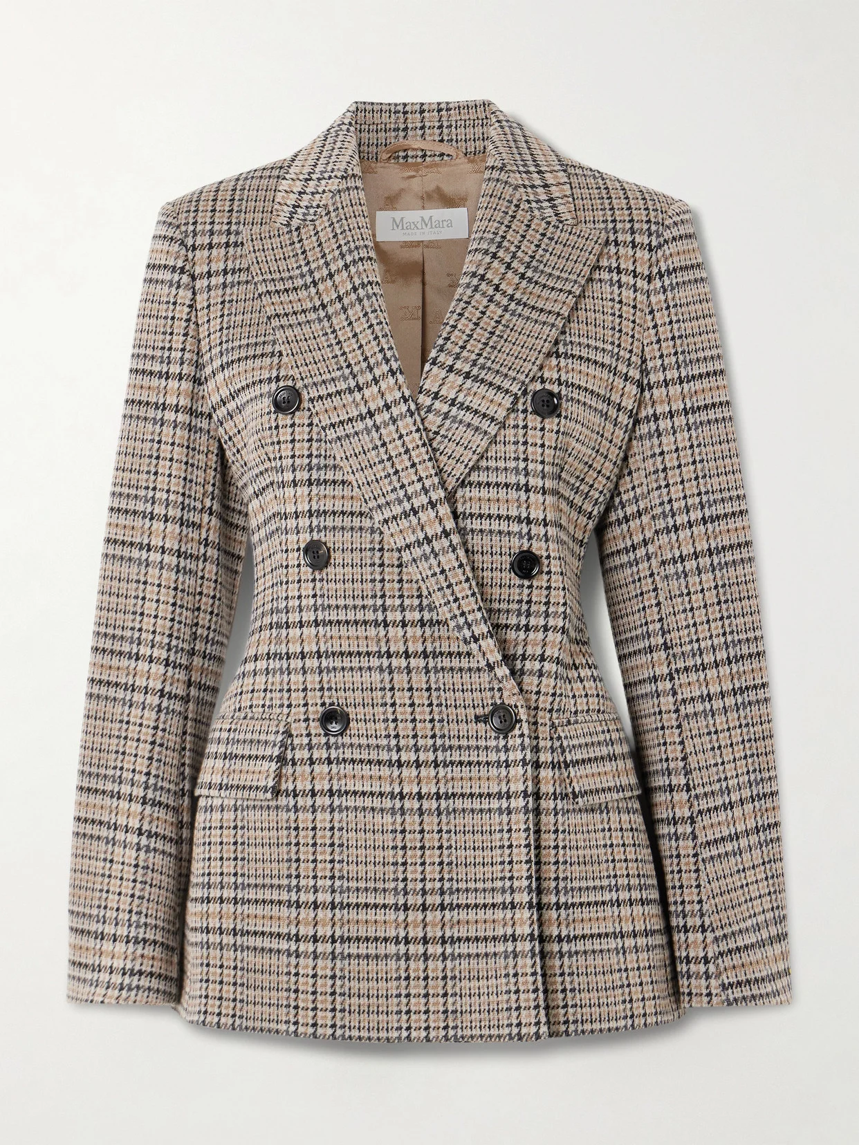 Max Mara's double-breasted blazer is inspired by heritage styles, so it'll truly stand the test of time. It's been tailored in Italy from houndstooth wool and cotton-blend in a subtle hourglass shape. It's finished with a logo-jacquard lining for smooth layering.