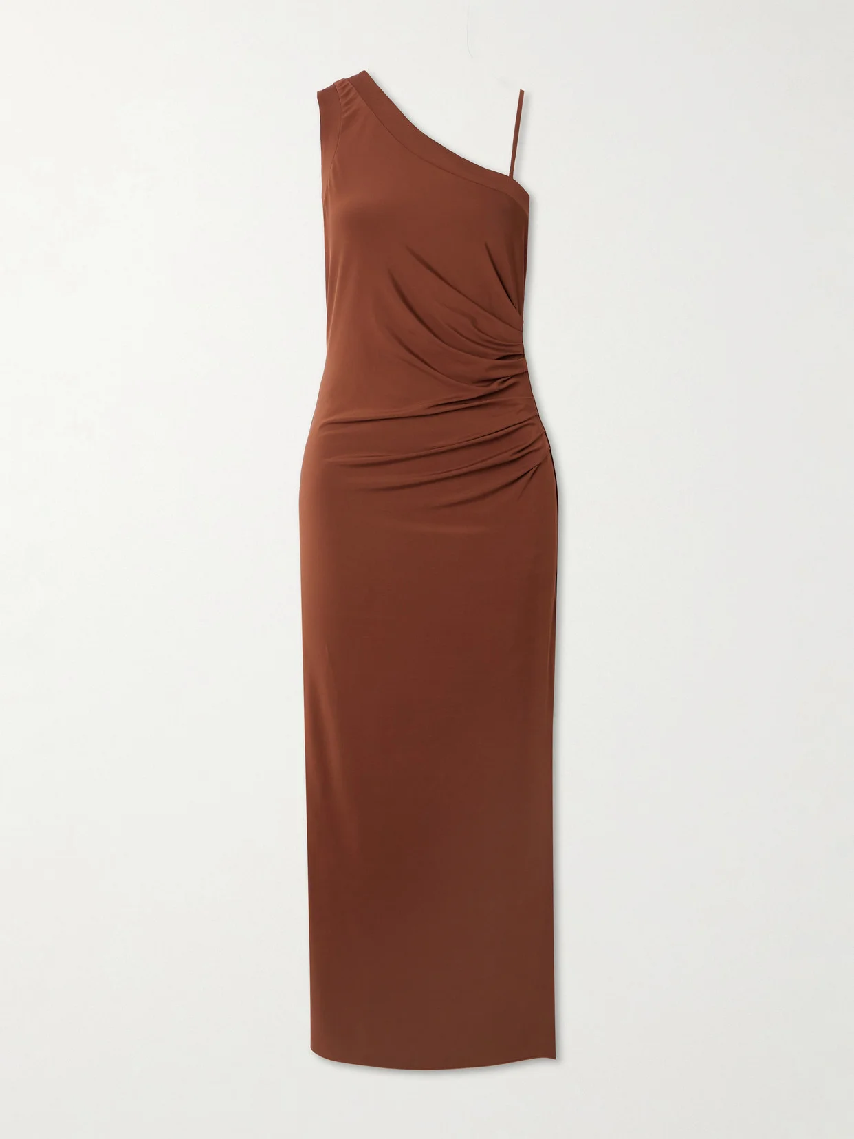 Max Mara's dress is made from contouring stretch-jersey. It has a pin-thin strap and one draped shoulder. The ruching adds a contemporary touch to the column cut.