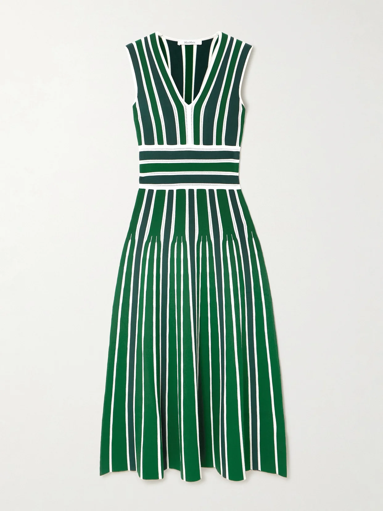 Max Mara's 'Tallone' midi dress is knitted with stripes, each one outlined with pointelle stitching. It has a deep V-neckline, cinched waist and softly flared skirt. Wear yours with point-toe flats or heeled sandals.