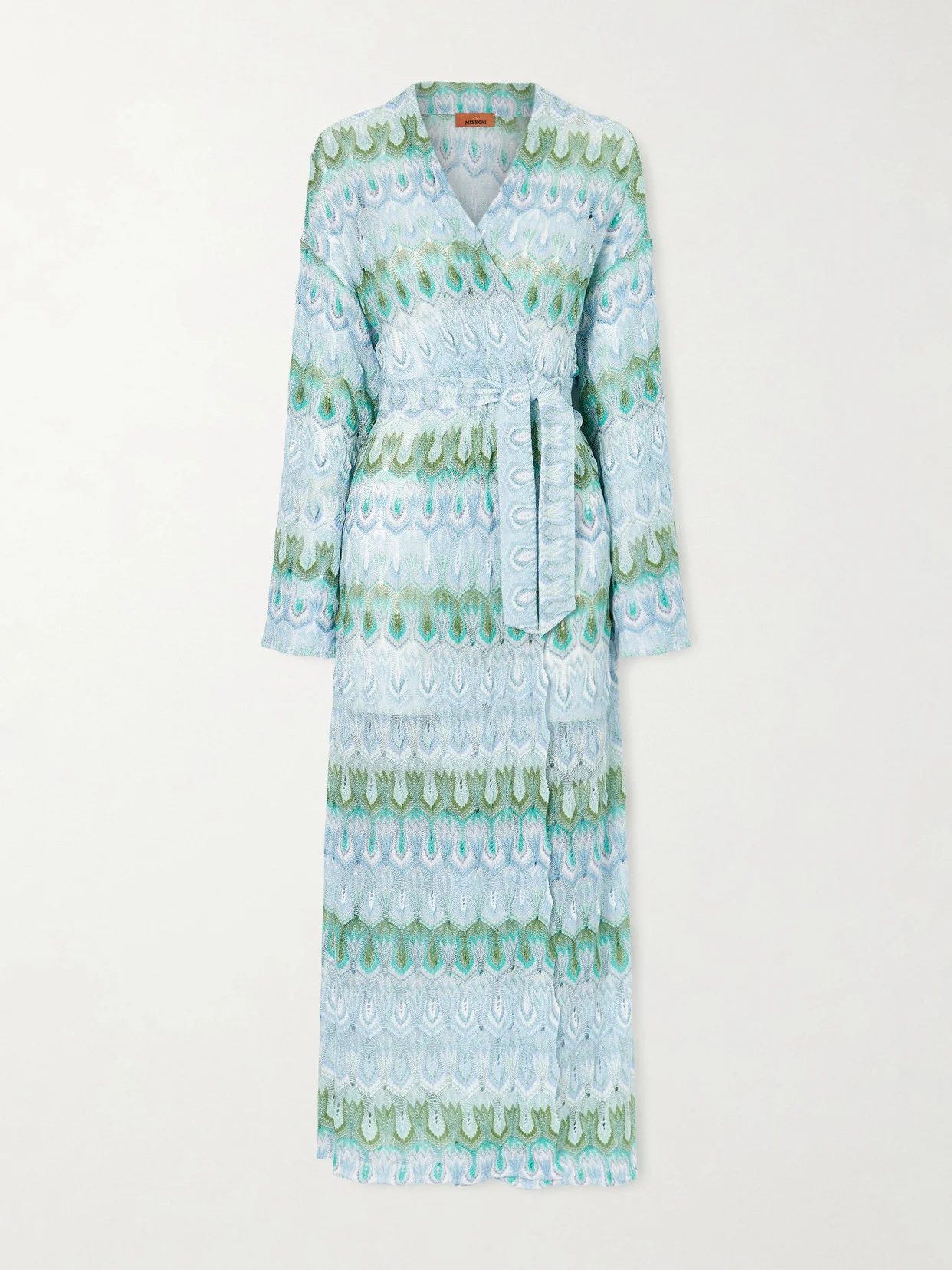EXCLUSIVE AT NET-A-PORTER. In layered shades of blue, Missoni's kaftan mirrors the ocean's shifting hues. It's crochet-knitted with metallic threads for a luminous effect, while the matching belt cinches the waist with ease.