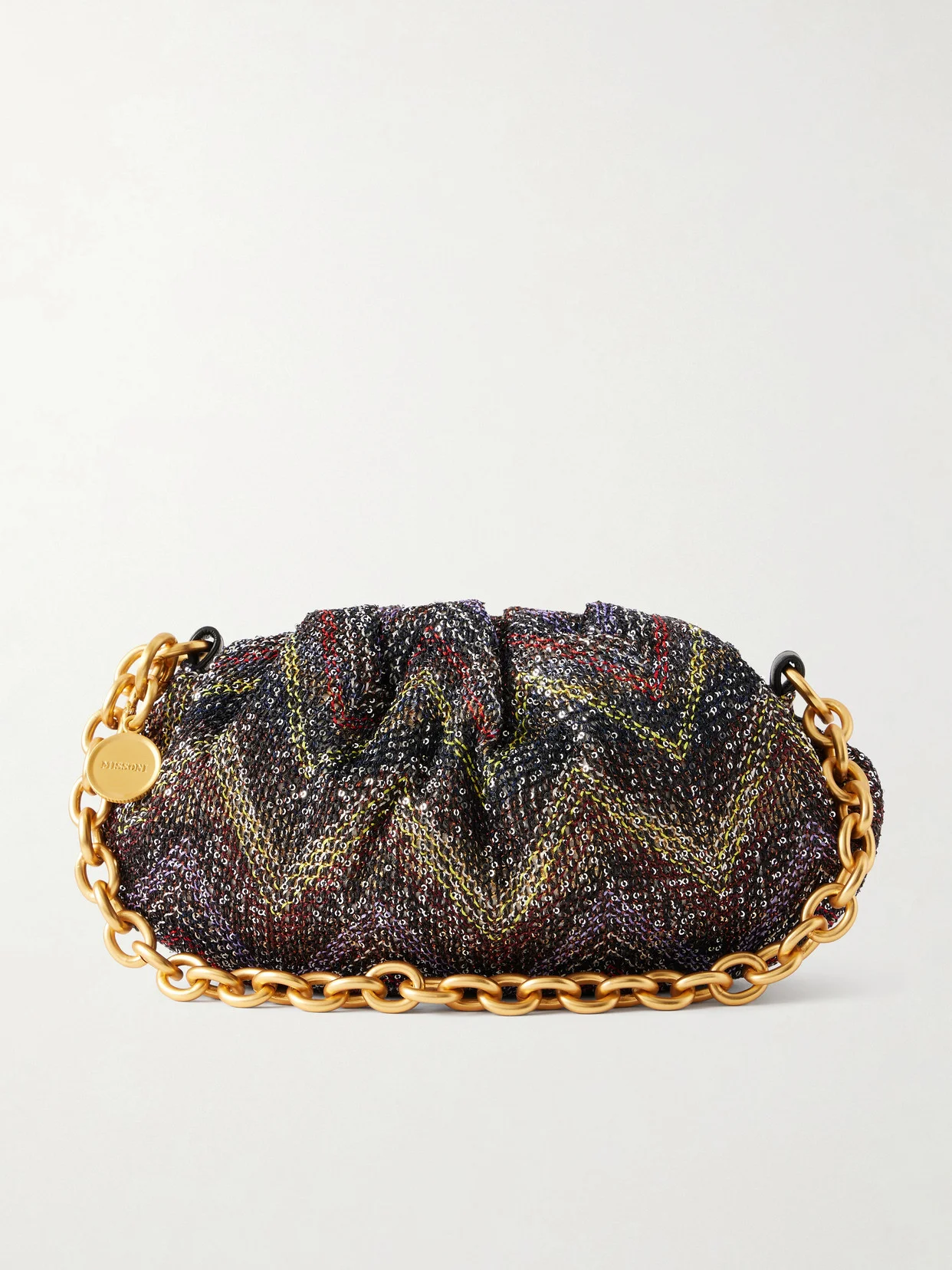 Missoni's ‘Caperdoni' pouch will bring a luminous touch to evening looks. Jacquard-woven with the house's signature zigzag stripes, it's traced with scores of sequins and finished with a detachable gold-tone chain for hands-free carry.
