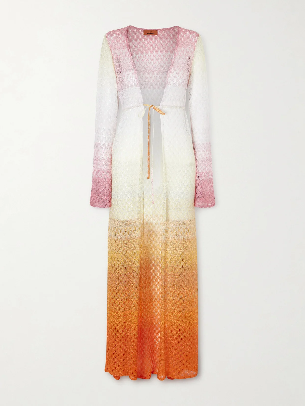 Missoni's coverup is crochet-knitted with its signature zigzags in a warm, colorful gradient. Flecked with metallic threads, it has an enveloping silhouette cinched by ties at the waist. Take it with you on your next trip, be it to Saint-Tropez or St. Barts.