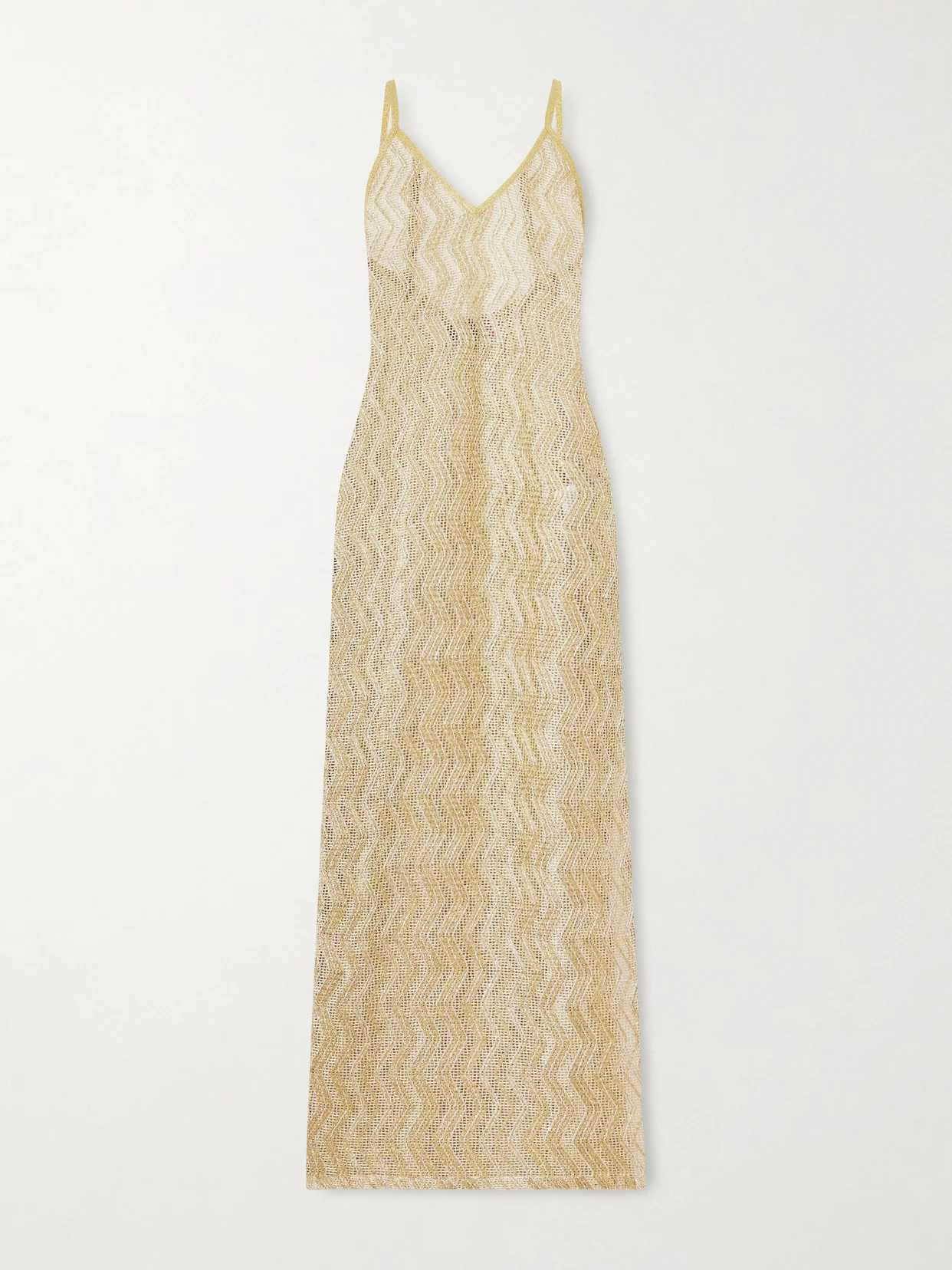 For vacation dressing, you want easy pieces that work for different moments - like Missoni Mare's coverup. It's crochet-knit from gold yarns that'll shimmer in the sun and look elegant for al fresco dinners. It has a plunging neckline with sultry side slits and a low-cut back.