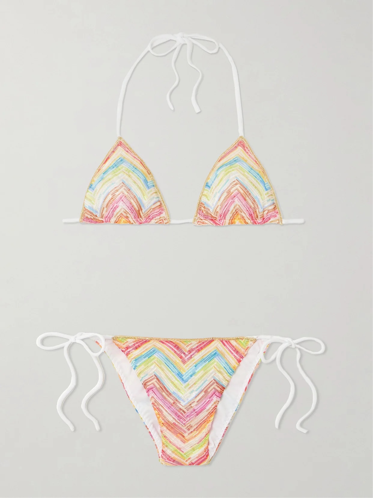 Missoni Mare's bikini is flecked with metallic threads which glimmer beautifully under the sun. It's made using the label's signature crochet-knit technique and has colorful zigzag stripes. Adjust the ties at the neck and hips to perfect your fit.