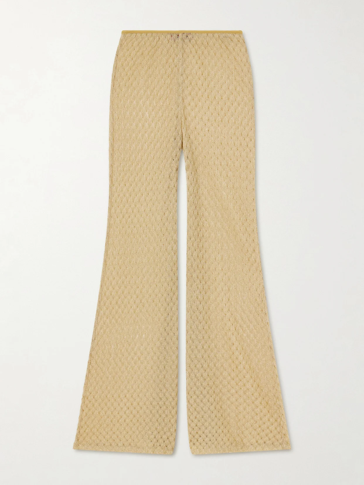 Missoni's signature knitwear takes on a luminous mood in these flared pants. Spun with metallic threads, the crochet-knit construction creates a textured, light-catching finish that enhances the fluid drape through the leg. The gently flared silhouette elongates the frame, making them a striking option for evening or sun-drenched escapes.