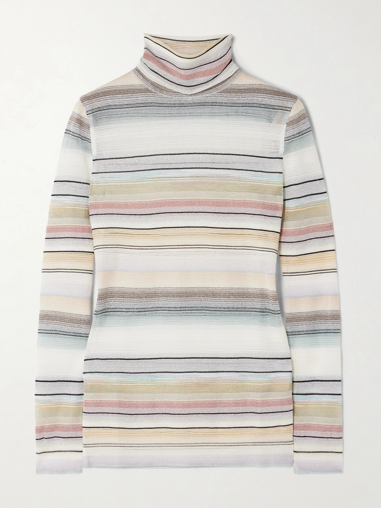 Missoni's Fall '25 collection features grounded staples rooted in the label's savoir-faire. Crochet-knitted with pastel stripes, this turtleneck sweater was styled on the runway with tweed and a chunky cardigan. Enhance the glimmer of the metallic threads with polished jewelry.