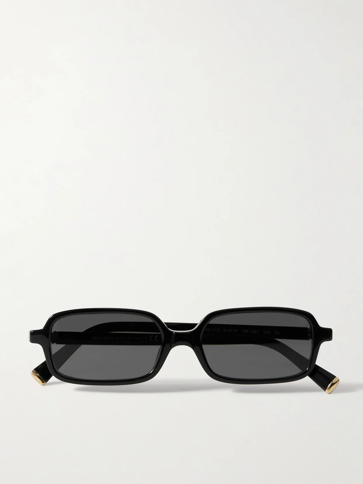 Miu Miu's sunglasses have slim rectangular frames that sit comfortably on the bridge of your nose. They're made from glossy black acetate and detailed with a gold-tone metal logo that matches the gilded tips of each arm.