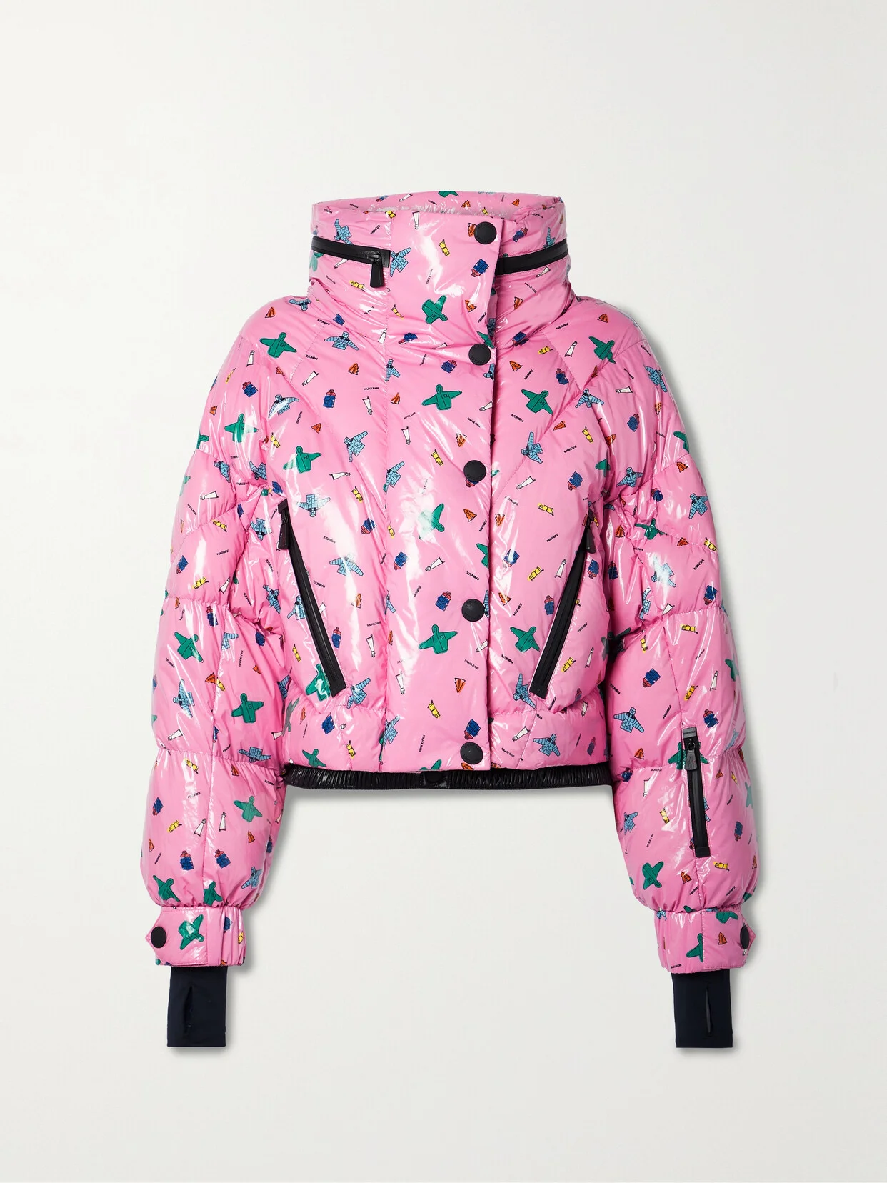 Moncler Genius' jacket is part of a collaboration with Naj-Oleari, an Italian label known for its playful motifs - note the array of skiwear sketches in vibrant hues. Made from glossed-shell, it has a quilted silhouette filled with insulating down and a funnel neck to block out harsh winds. Style yours with the matching stirrup pants on the slopes.