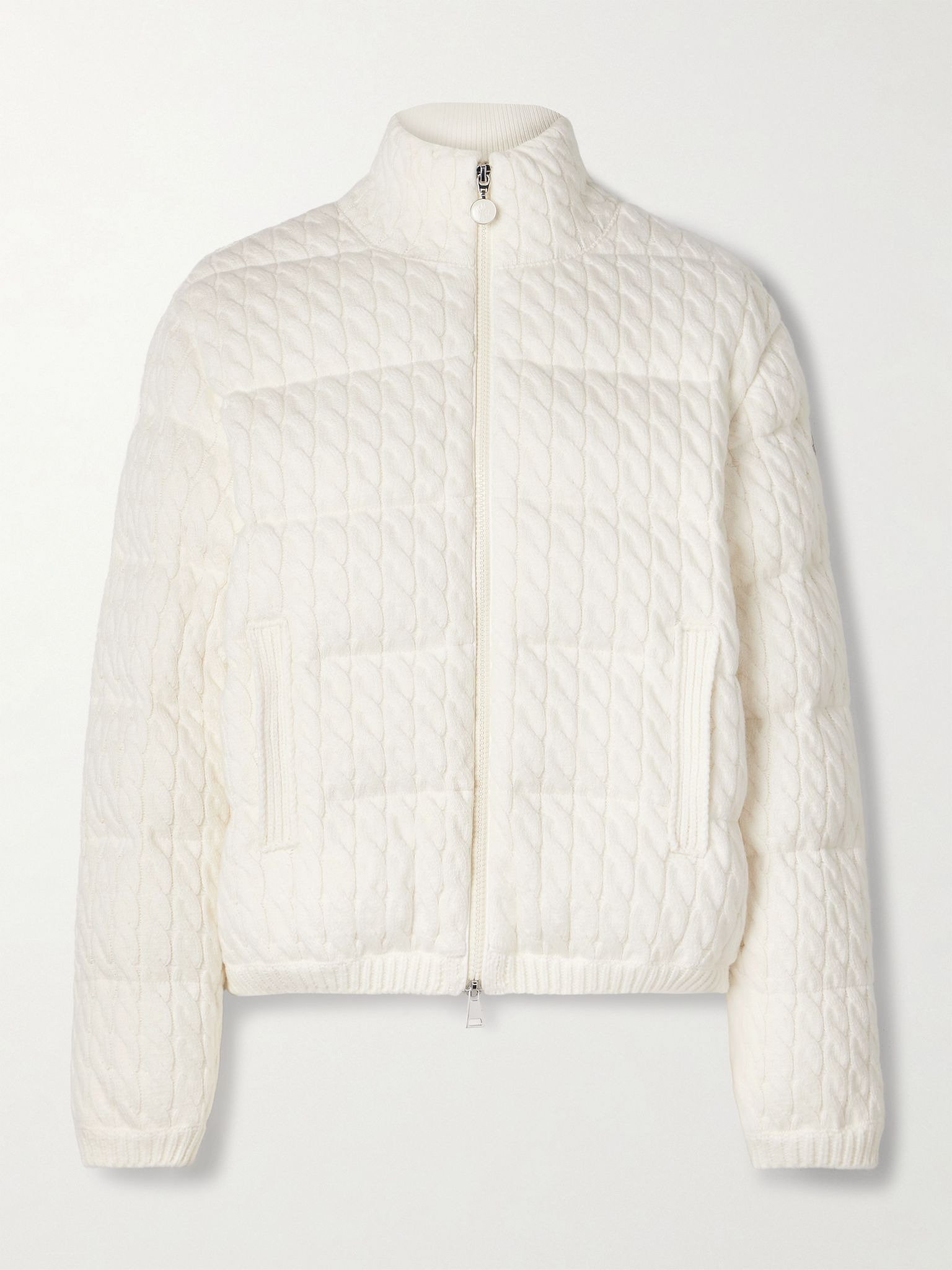 Moncler's jacket blends the luxury of knitwear with the brand's outerwear expertise. Made from a cable-knit cotton-blend, it has a quilted, padded structure that's filled with insulating down and a full shell lining for smooth layering. Size & Fit - Fits true to size, take your normal size - Designed for a slightly loose fit - Short in the sleeves - Ribbed hem - Quilted, non-stretchy fabric - Model is 180cm/ 5’11” and is wearing a size XSmall Model measurements: - Bust: 81cm/ 32" - Waist: 64cm/ 25" - Hip: 89cm/ 35" Details & Care - Ivory cotton-blend - Two-way zip fastening through front - 68% cotton, 32% polyester; filling: 90% down, 10% feathers (Goose); lining: 100% polyamide - Fully lined - Dry clean
