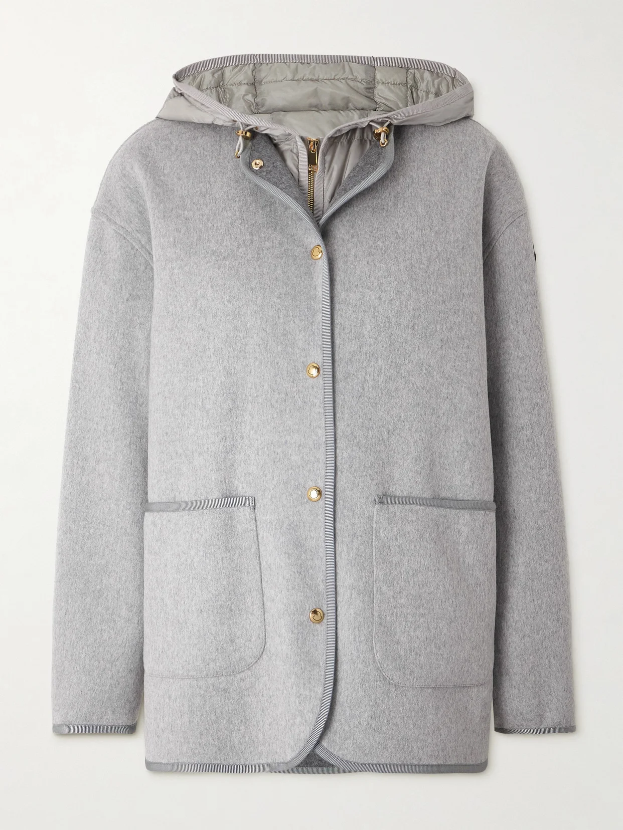 Moncler's 'Reposse' jacket is made up of detachable elements, creating a versatile yet elegant 3-in-1 design. It's made from wool and cashmere-blend in a relaxed shape that's outlined with tonal grosgrain trims and has an inner hooded quilted shell gilet that can also be worn solo.