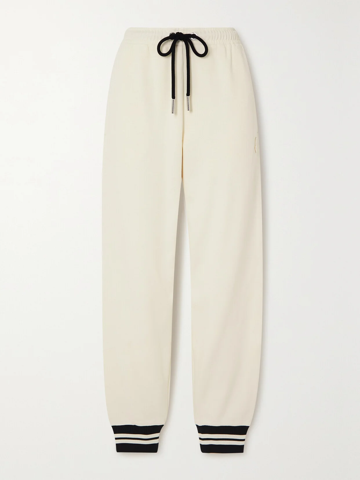 Taking cues from retro sportswear, Moncler's track pants are made from off-white cotton-blend jersey and detailed with stripes at the cuffs. They have a contrasting black drawstring and discreet logo on the side.