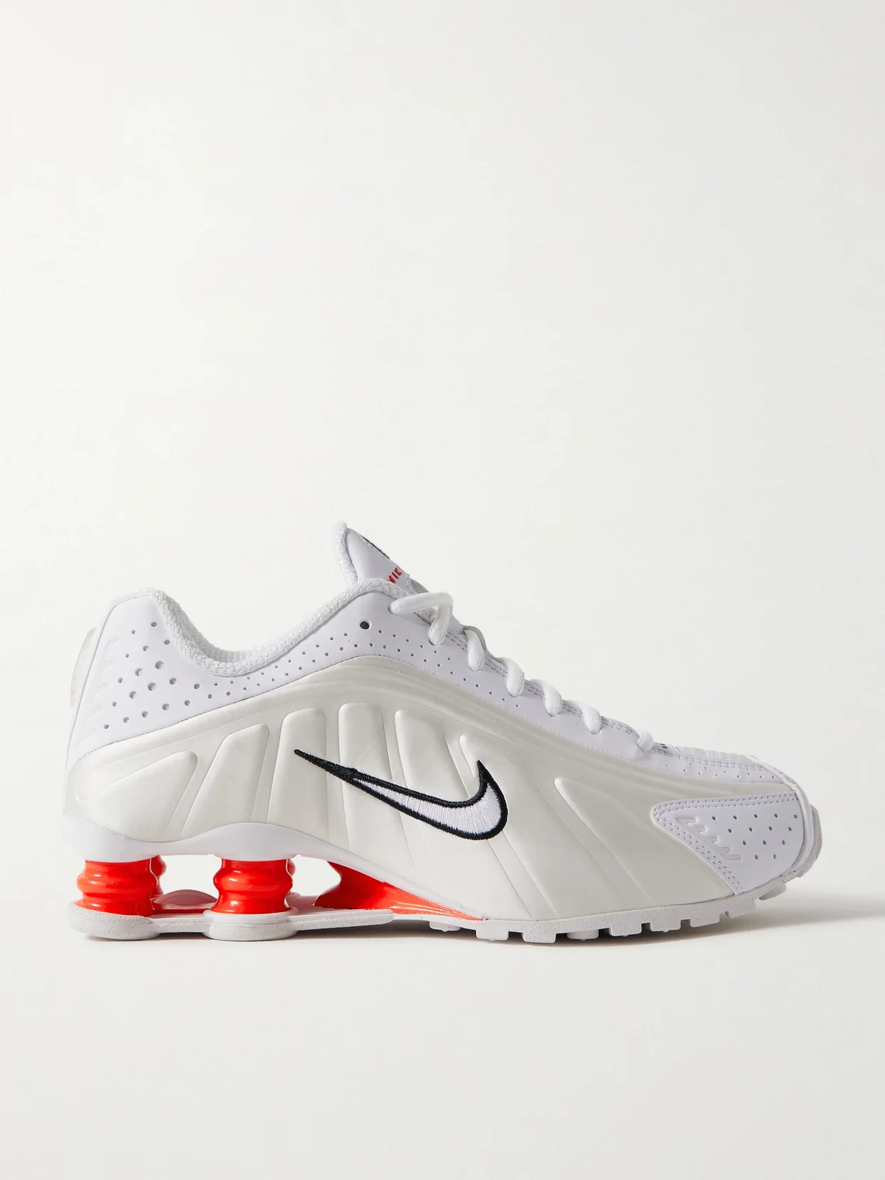 Nike's sneakers are a re-imagined version of the early 2000s original. Made from panels of perforated shell, they're embroidered with a signature 'Swoosh' on the sides and rest on rubber 'Shox' soles, which provide spring with every step.