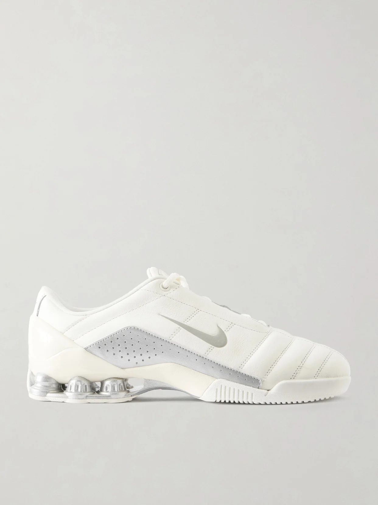 Nike revisits its early-2000s football archive with these ‘T90 Shox Magia QS' sneakers. Made from smooth leather, they're detailed with the quilted lines and asymmetric lacing of the original indoor-pitch design, while silver Shox columns at the heel bring cushioning and a distinctly retro finish.