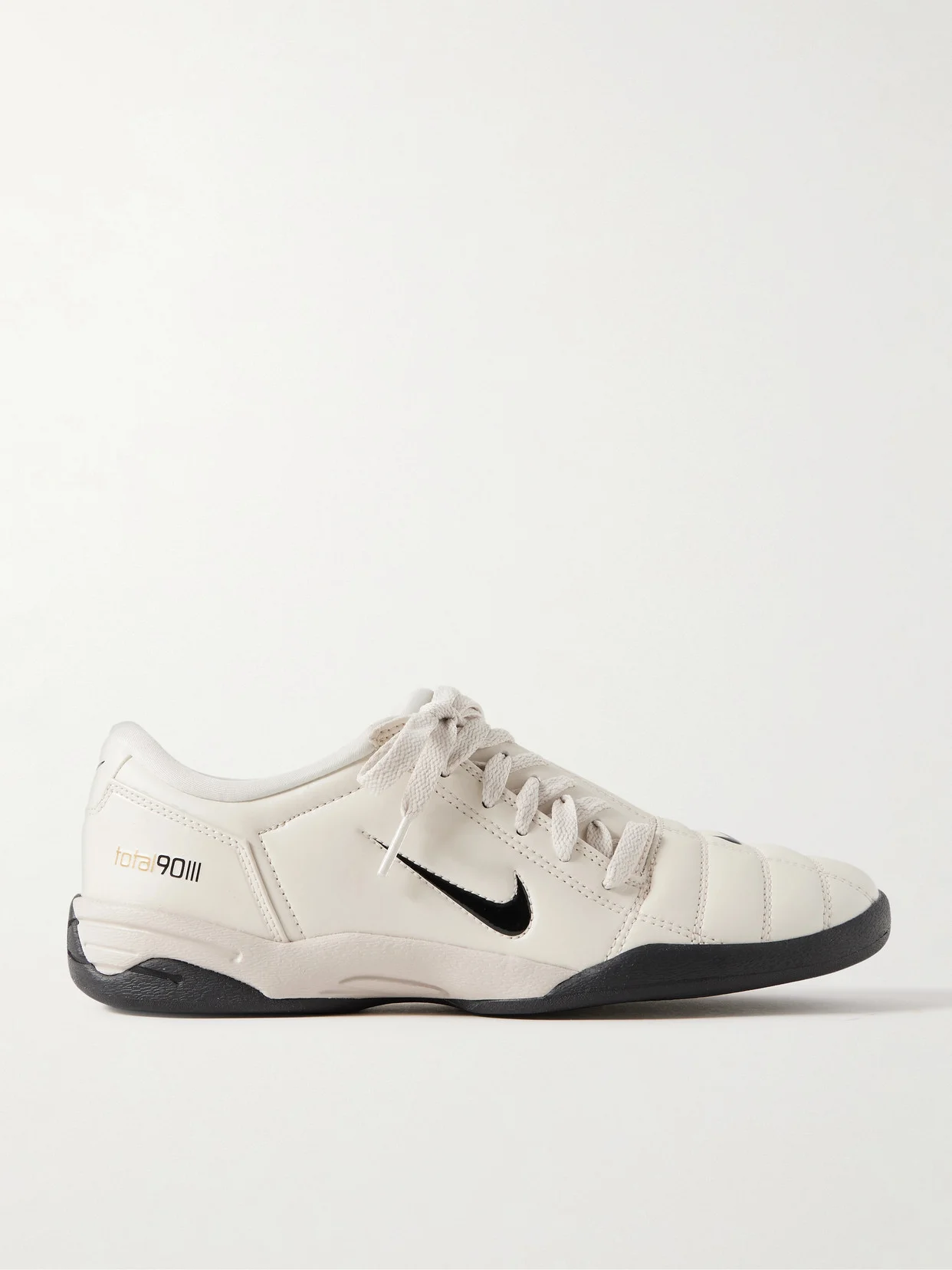 Originally introduced in 2000, Nike's 'Total 90' sneakers are making a comeback with a modern twist, bringing their iconic style from the field to the streets. They're crafted from ecru leather detailed with subtle logos and set on flat rubber soles.