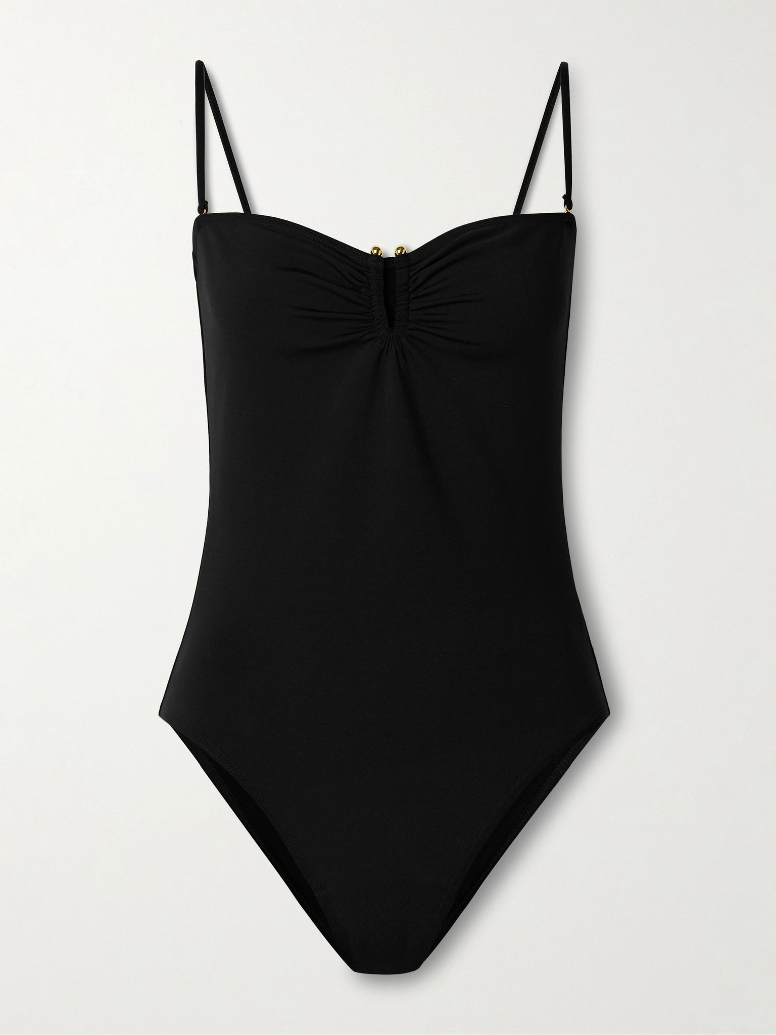 Nili Lotan's understated swimsuit is punctuated with signature gold-tone hardware at the center for a glamorous touch. It has adjustable, detachable straps and offers full coverage. Size & Fit - Fits true to size, take your normal size - Fully adjustable shoulder straps - Detachable straps - Medium brief coverage - Model is 175cm/ 5'9", bra size 32C and is wearing a size Small Details & Care - Black stretch-nylon - Pulls on - 74% nylon, 26% elastane - Machine wash - Lotion, sunscreen, oil and chlorine can cause discoloration of this item; this is not a manufacturing defect. Please follow care instructions to keep your swimwear in the best condition