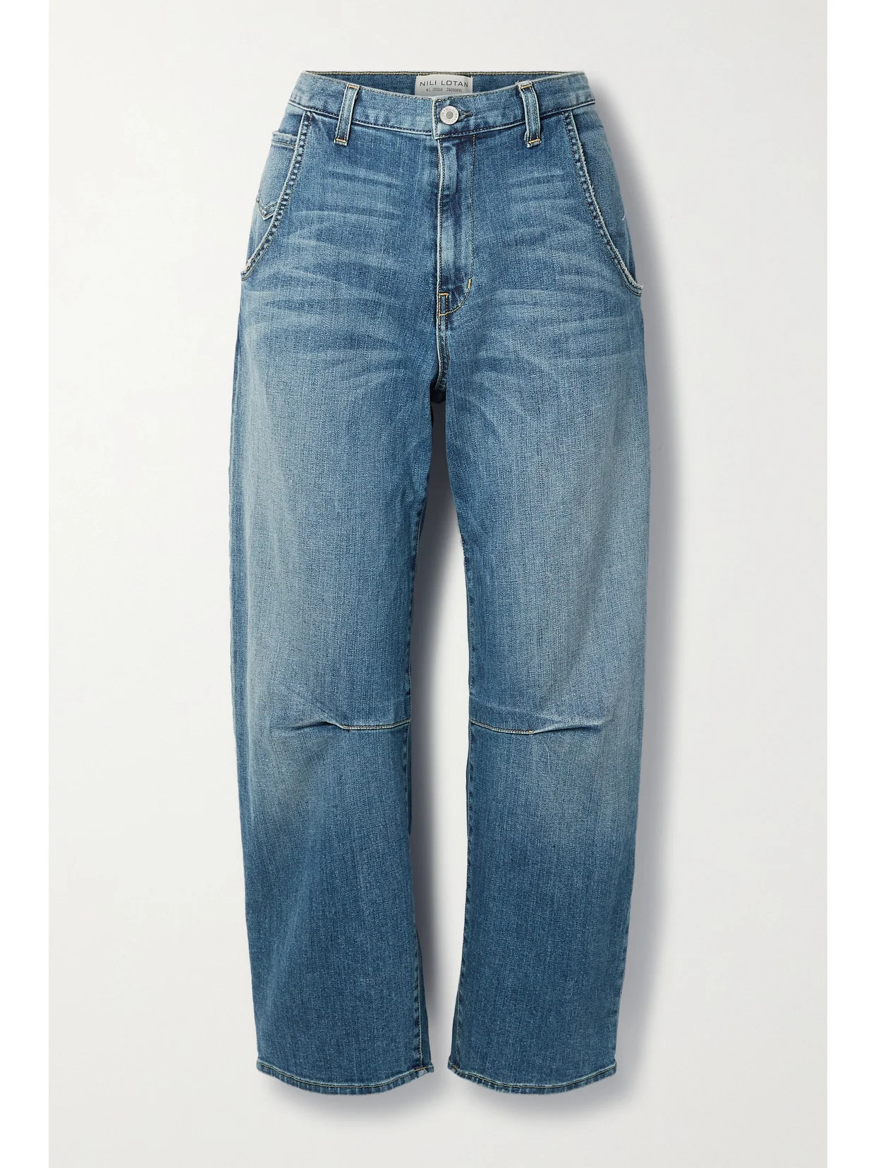 Nili Lotan's 'Emerson' jeans are designed in a barrel silhouette with loose legs that taper at the slightly cropped hems. This high-rise pair is made from 'Classic' blue denim that's faded and whiskered for a lived-in feel. The uniquely placed pockets give them a distinct utilitarian vibe.