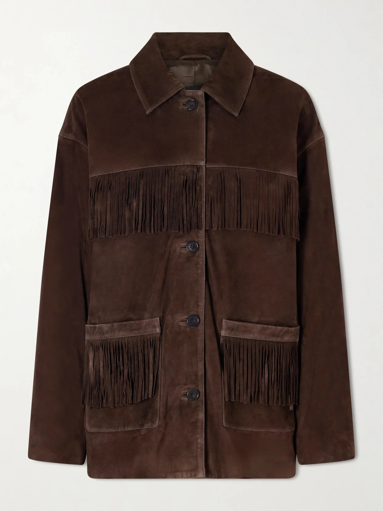 Nili Lotan channels a confident, free-spirited sensibility through tactile fabric and clean lines. Crafted from supple suede, this jacket is finished with swaying fringe that brings movement and subtle drama to its structured shape.