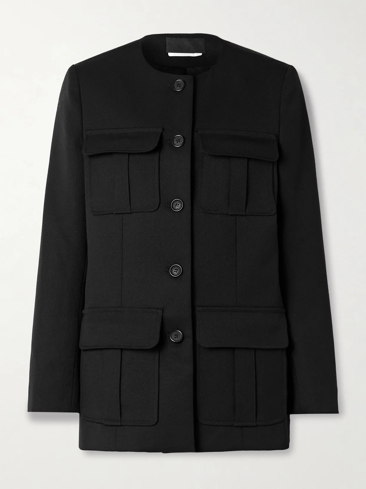 The pockets on Nili Lotan's 'Gabriella' jacket give it a utilitarian feel. Made from black wool-twill, it has a chic, collarless design and lightly padded shoulders. The smooth satin lining ensures easy layering over everything from T-shirts to chunky sweaters.