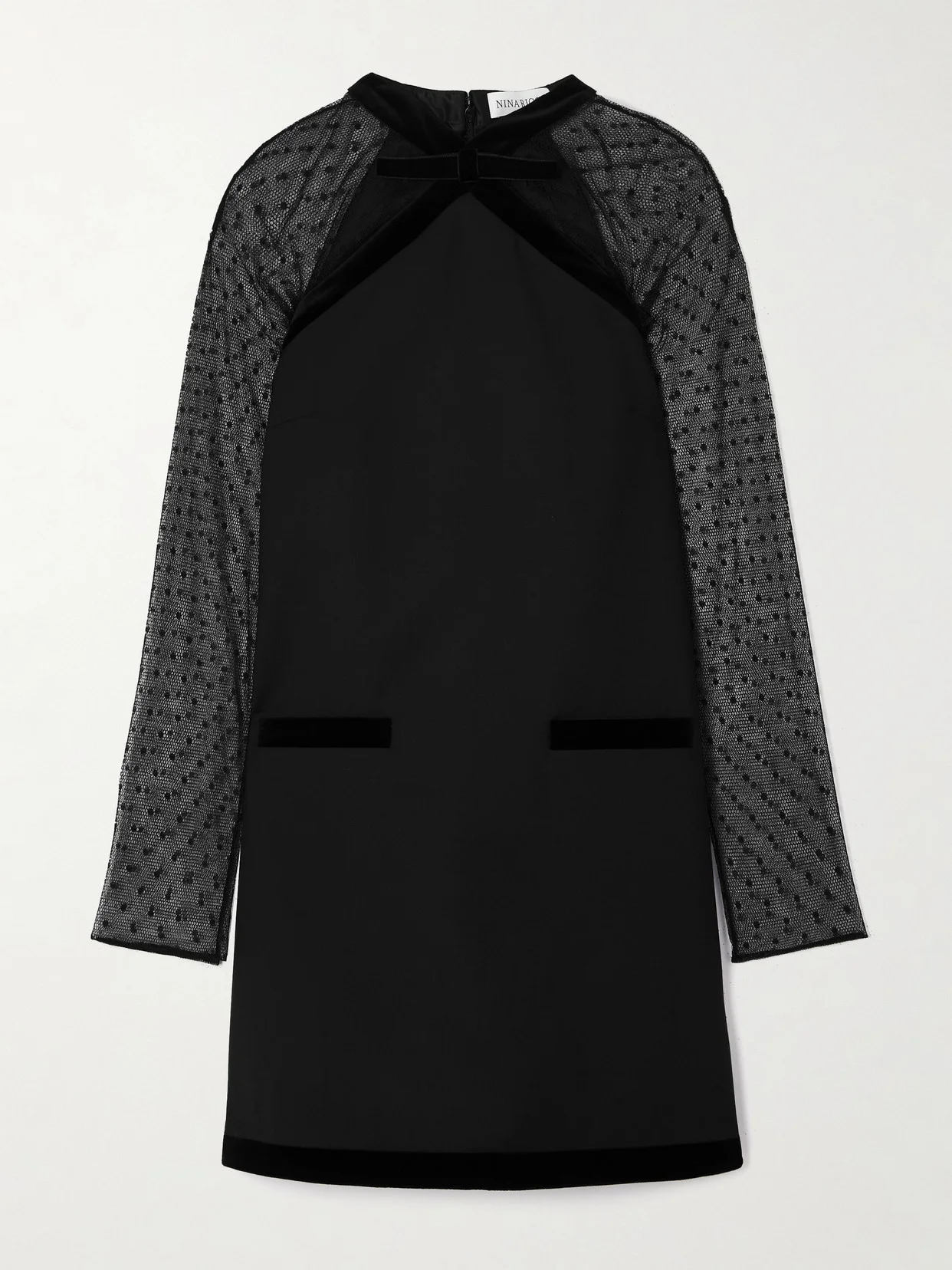 Nina Ricci's mini dress is a chic choice for evening events. Cut from wool-gabardine, it has polka-dotted tulle sleeves and a lavalliere bow at the neck. The velvet trims add a decadent touch.