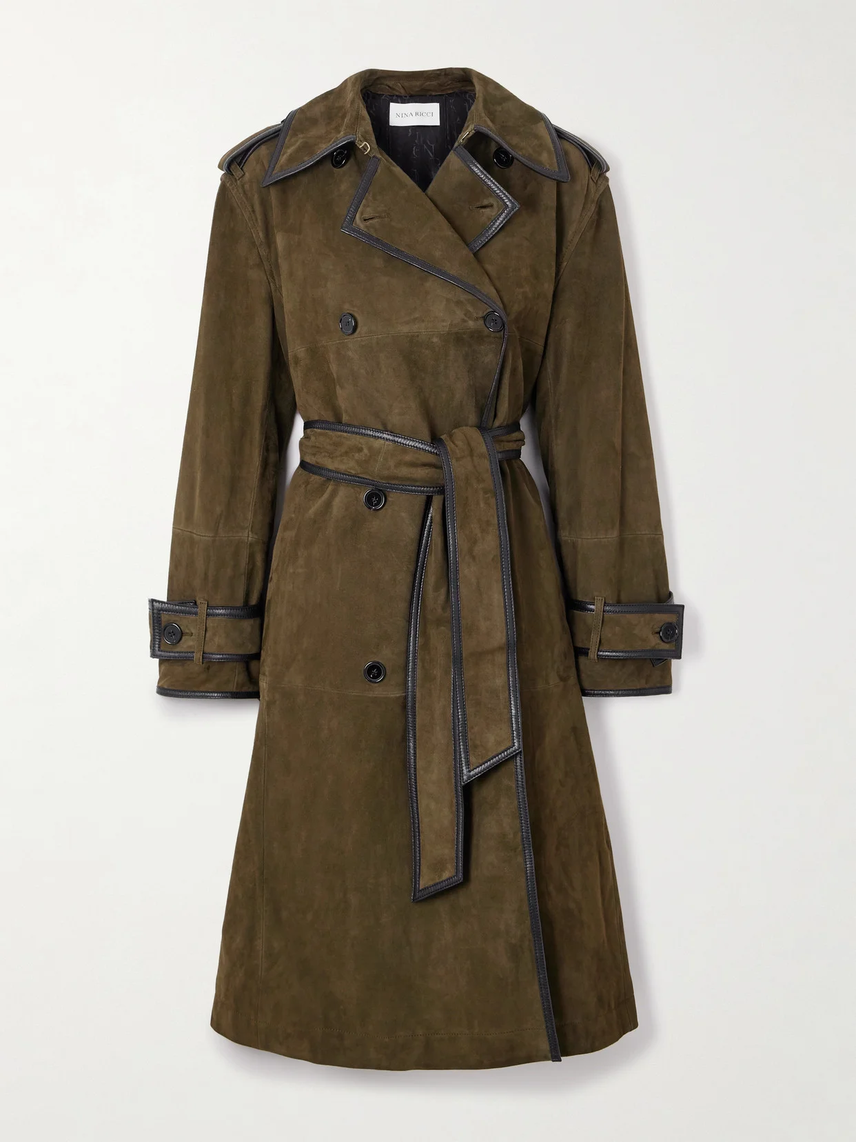Nina Ricci's trench coat is endlessly chic. Made from smooth suede, it has a double-breasted front and black leather trims. It comes with two belts - a coordinating style and a contrasting antique-rose velvet one.