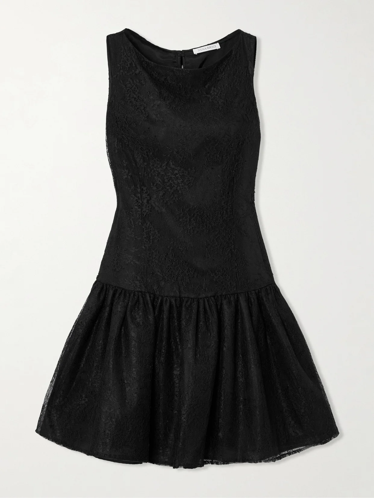 Nina Ricci's mini dress exudes romantic elegance and femininity. Made from black Chantilly lace that's lined for coverage, it fits slim through the bodice and is gathered along the basque waist to create a voluminous skirt. Don't miss the pretty velvet bows tracing the reverse.