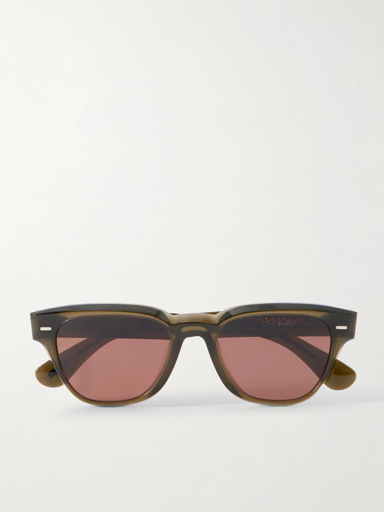 Oliver Peoples' 'Rueny' sunglasses are a classic D-frame pair that will always be in style. Made from glossy green acetate, they have the label's signature silver-tone temple pins and gray tinted lenses.