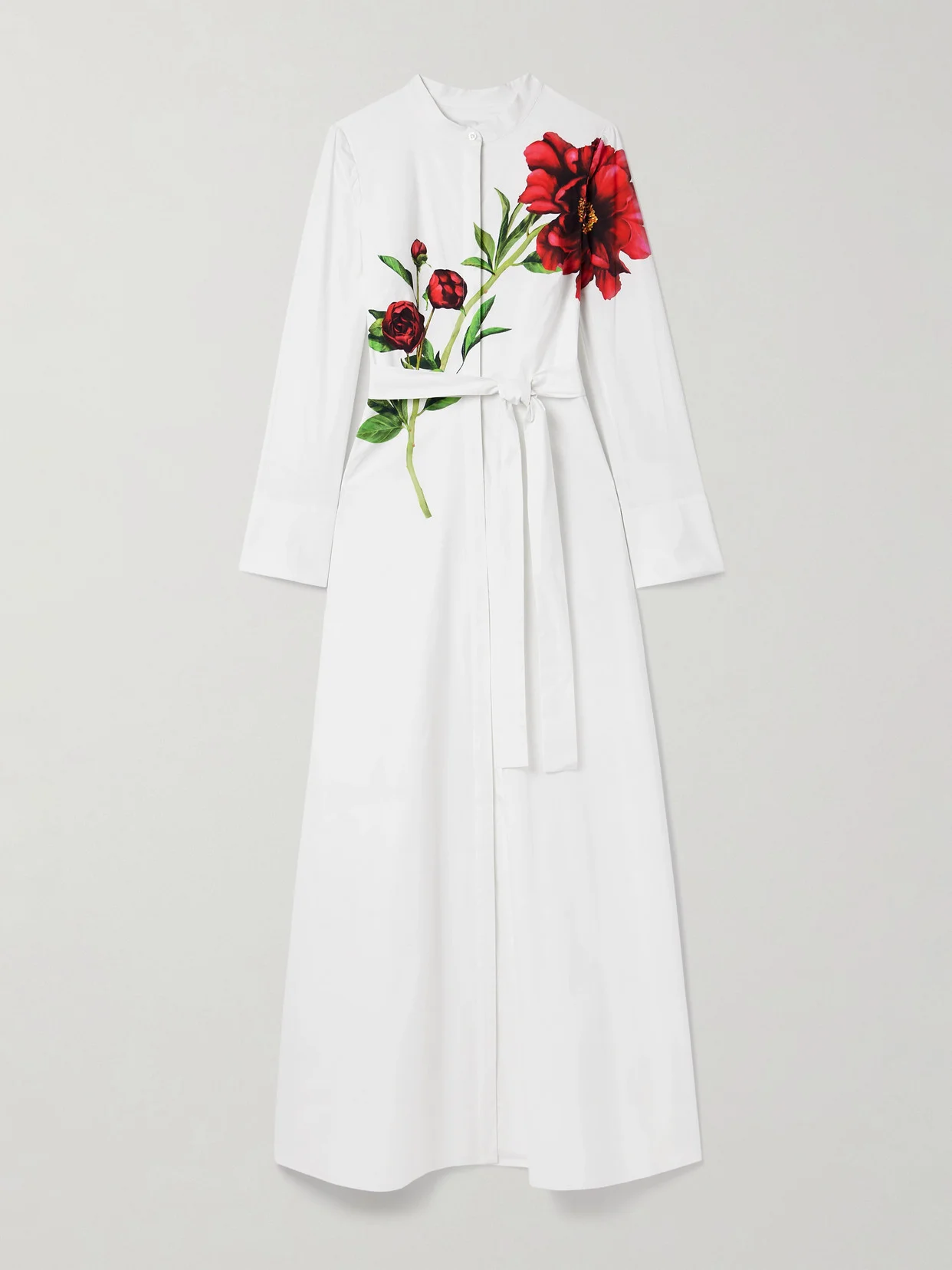 Oscar de la Renta's dress is printed with a vibrant, lifelike peony along the bodice - the flower's beauty is the source of inspiration behind the Fall '25 collection. It's made from crisp cotton-blend poplin and has a sash to define your waist.