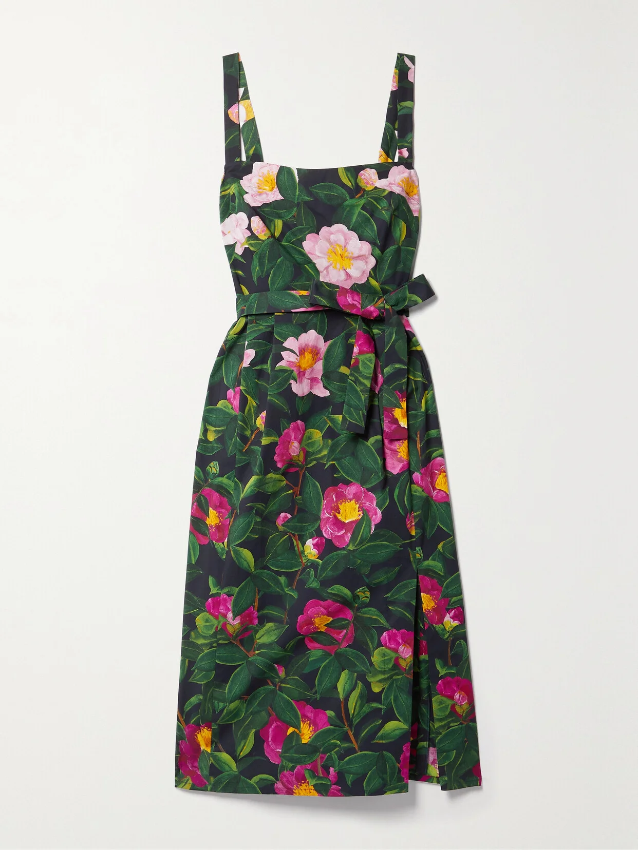 Oscar de la Renta used to spend endless hours tending to his gardens in Connecticut and the Dominican Republic as a form of relaxation, and the beauty of the blooms served as inspiration for his designs. Continuing that legacy for Spring '24, this midi dress is made from cotton-poplin decorated with lifelike camellia flowers. Use the self-tie belt to cinch and define your waist.