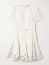 Oscar de la Renta's dress is embroidered with cutouts along the scalloped hem, adding architectural precision to the sweet, floaty design. It's made from cotton-blend tweed and has a slim fit balanced by godet pleats.