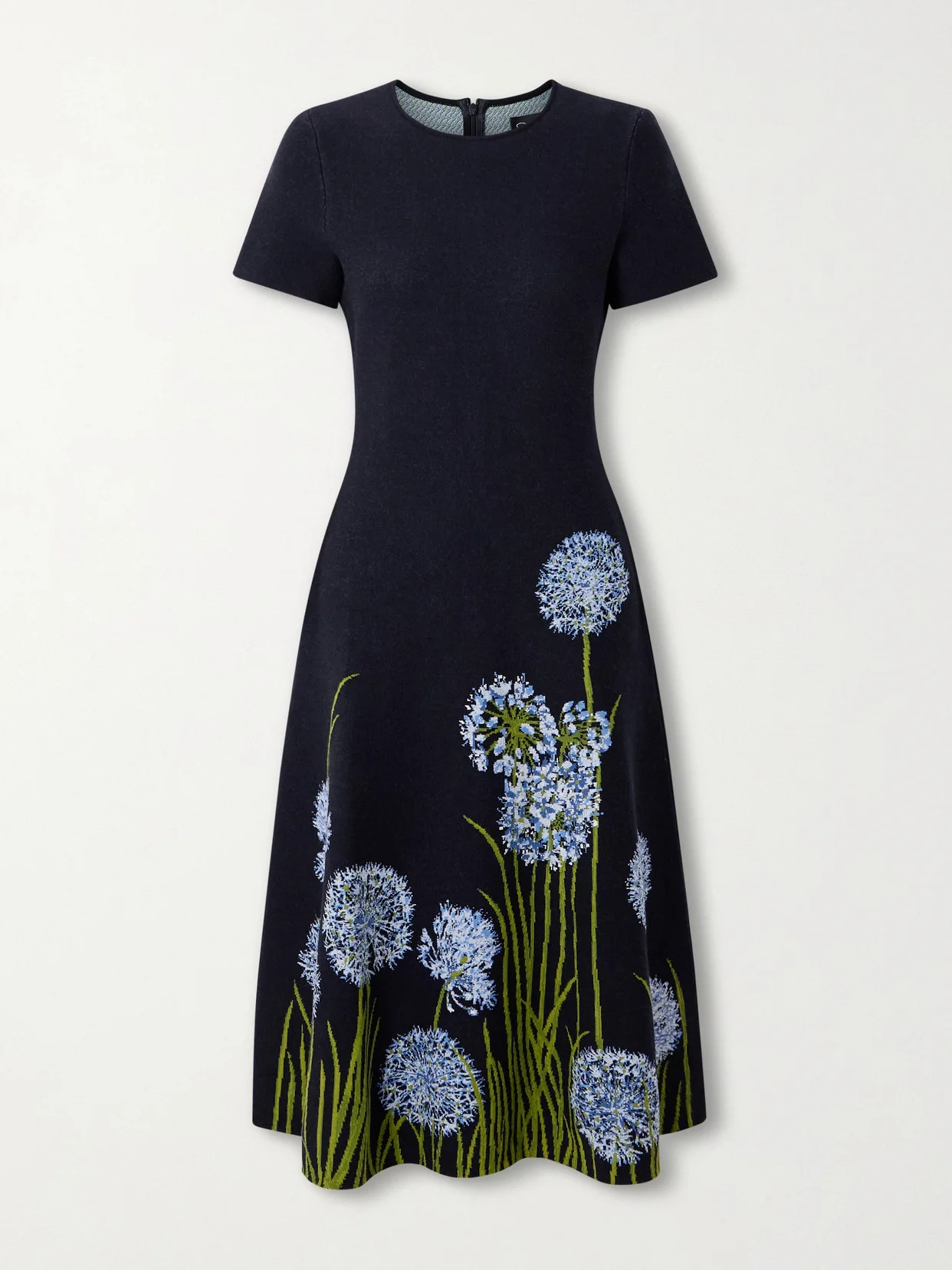 For Oscar de la Renta's Pre-Spring '26 collection, co-creative directors Laura Kim and Fernando Garcia took inspiration from their own gardens while dreaming up the illustrative floral motifs. This dress is jacquard-knitted with blooming alliums and has an elegant A-line, midi shape.