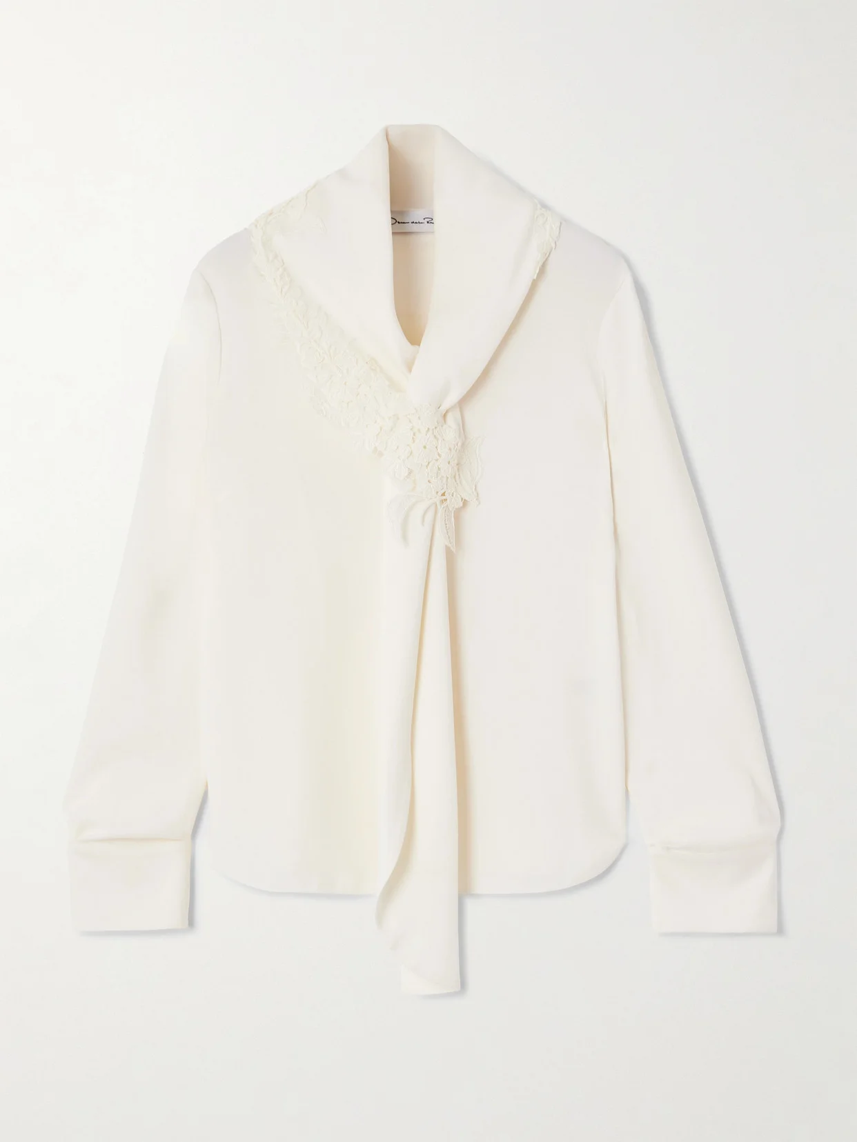 Oscar de la Renta's blouse is made from silk-blend georgette that naturally drapes over your frame. It's cut for a slightly loose shape and has pretty lace edging the collar and languid ties. Knot yours into a bow for a chic take.