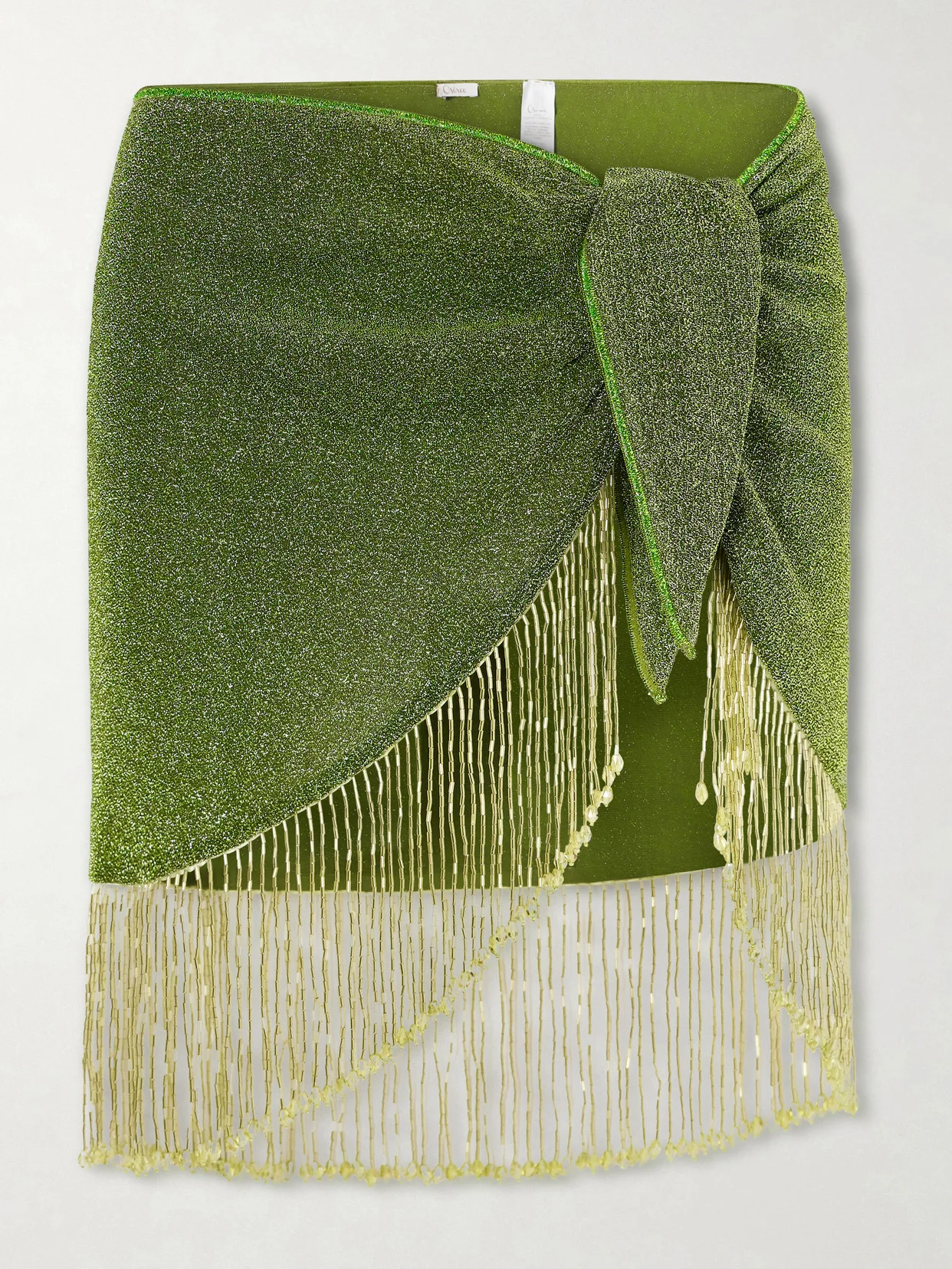 Designed to shimmer in the sun, Oseree's pareo is a glamorous statement. Made from metallic stretch Lurex, it knots at the waist for a fluid drape, traced with swaying beaded threads that catch the light. Wear it over the matching swimsuit.