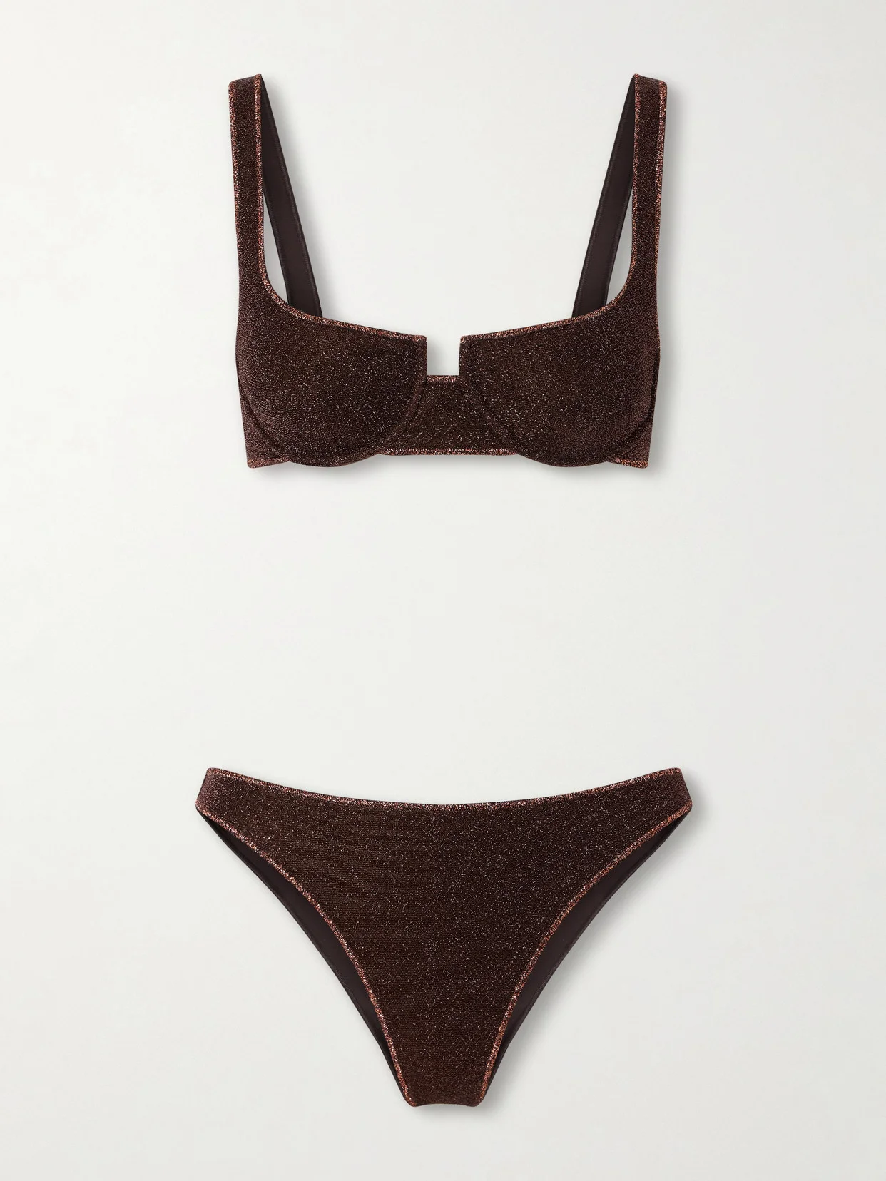 Oseree's 'Lumiere' bikini is made from dark-brown metallic fabric that shimmers as it catches the light. It has a balconette top with supportive wired cups and low-rise briefs. Wear yours with one of the label's coverups.