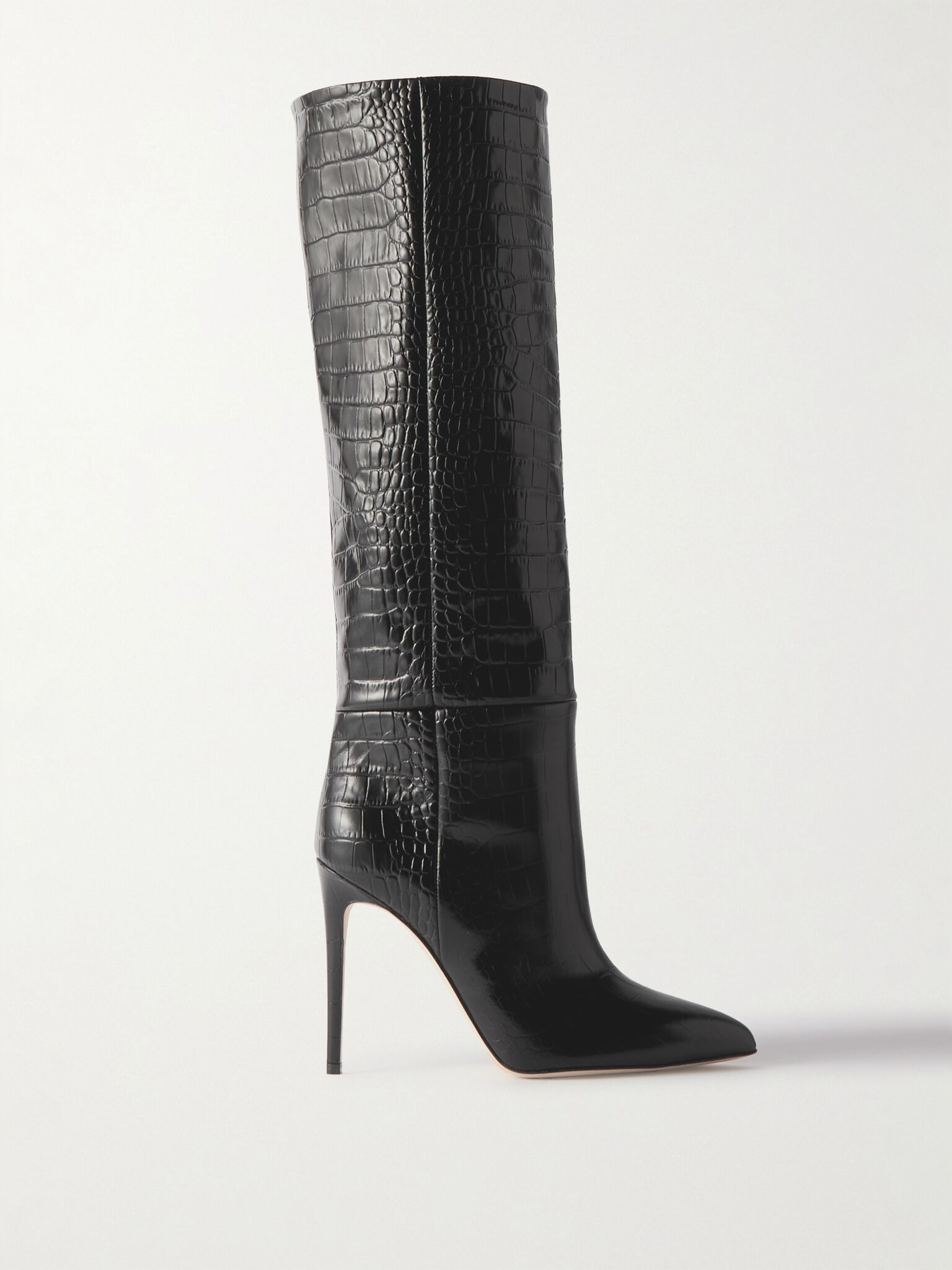 Paris Texas' boots are made from glossy croc-effect leather in a knee-high shape. They have sharply pointed toes and 105mm stiletto heels. Wear yours with everything from jeans to dresses. Size & Fit - Fits true to size, take your normal size - Italian sizing Details & Care - Heel measures approximately 105mm/ 4 inches - Black croc-effect leather (Calf) - Pull on - Designer color: Carbone