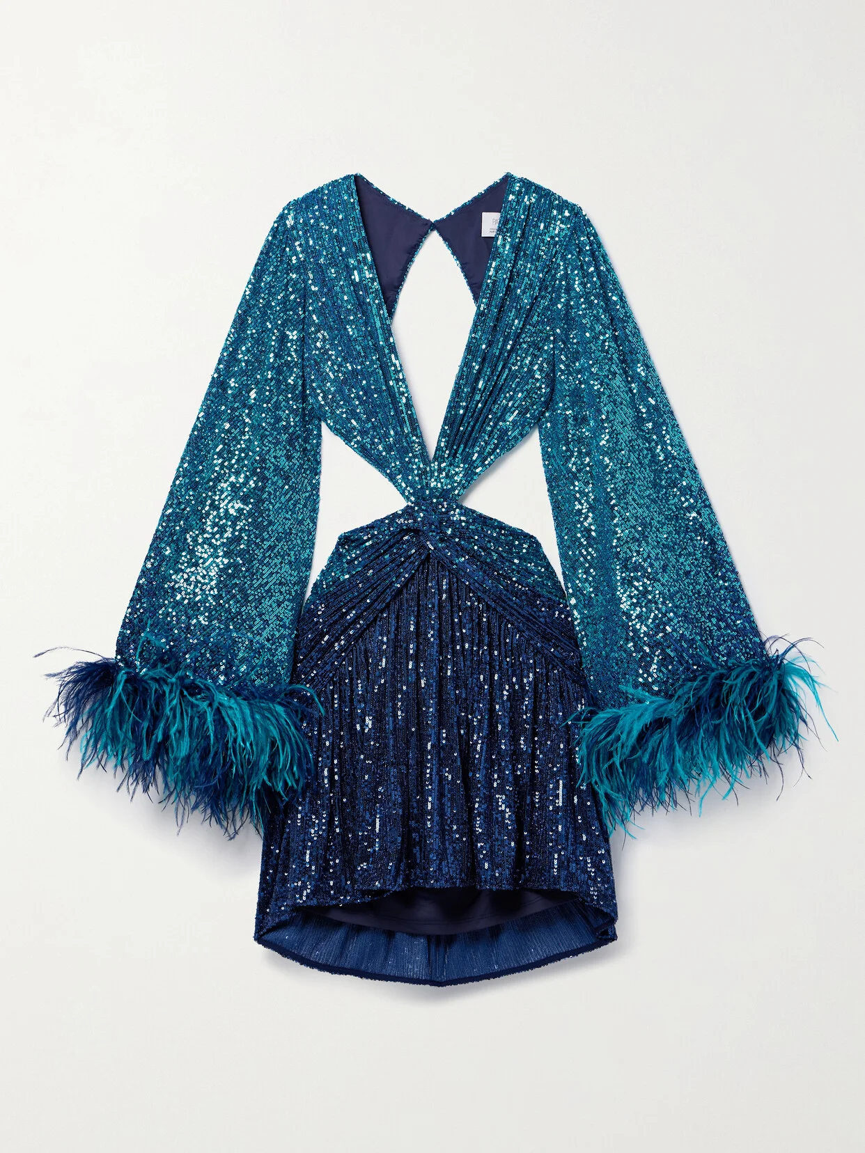 Part of PatBO's second collaboration with supermodel Alessandra Ambrosio, this mini dress embodies the lively spirit of Miami. It's made from tulle covered in light-reflecting sequins and has skin-revealing details, including a plunging neckline and a cutouts bodice. The wide bell sleeves are traced with wispy feathers along the cuffs.