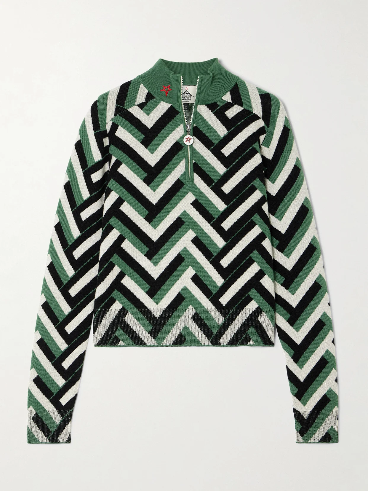 Perfect Moment is so good at bold prints and patterns. Made from merino wool, this 'La Tour' sweater is jacquard-knitted with chevron stripes and has a half-zip placket to adjust the funnel neckline. Wear yours with the matching 'Chalet' pants in our edit.