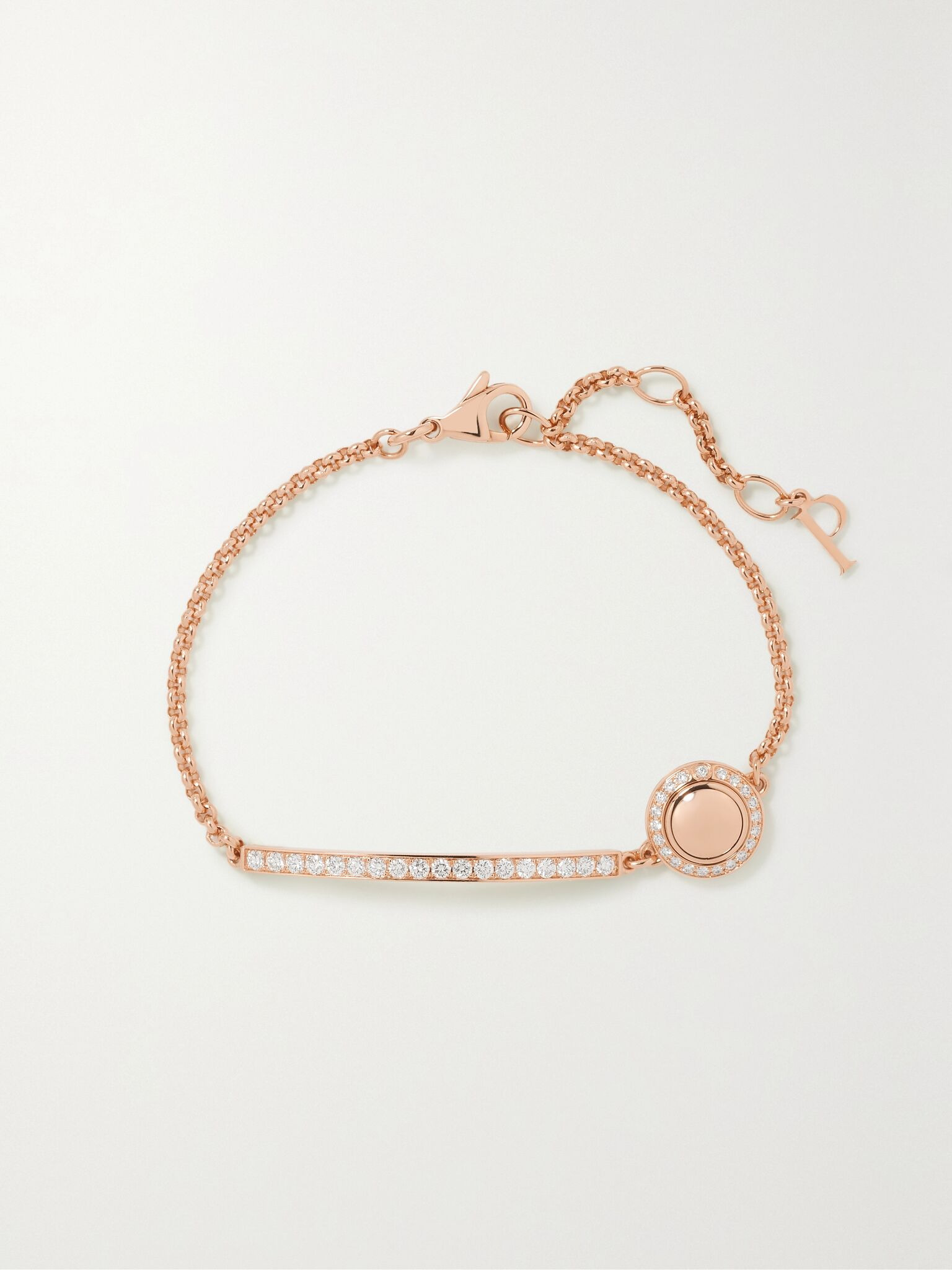 This dainty bracelet is part of Piaget's signature 'Possession' collection - the round bezel charm recalls the original 'turning ring' from 1990. It's crafted from 18-karat rose gold and dusted with brilliant-cut diamonds. The chain is strung with a signature 'P' charm at the adjustable clasp Details & Care - Brilliant-cut D-G diamonds, total weight: 0.468-carats - Lobster clasp fastening