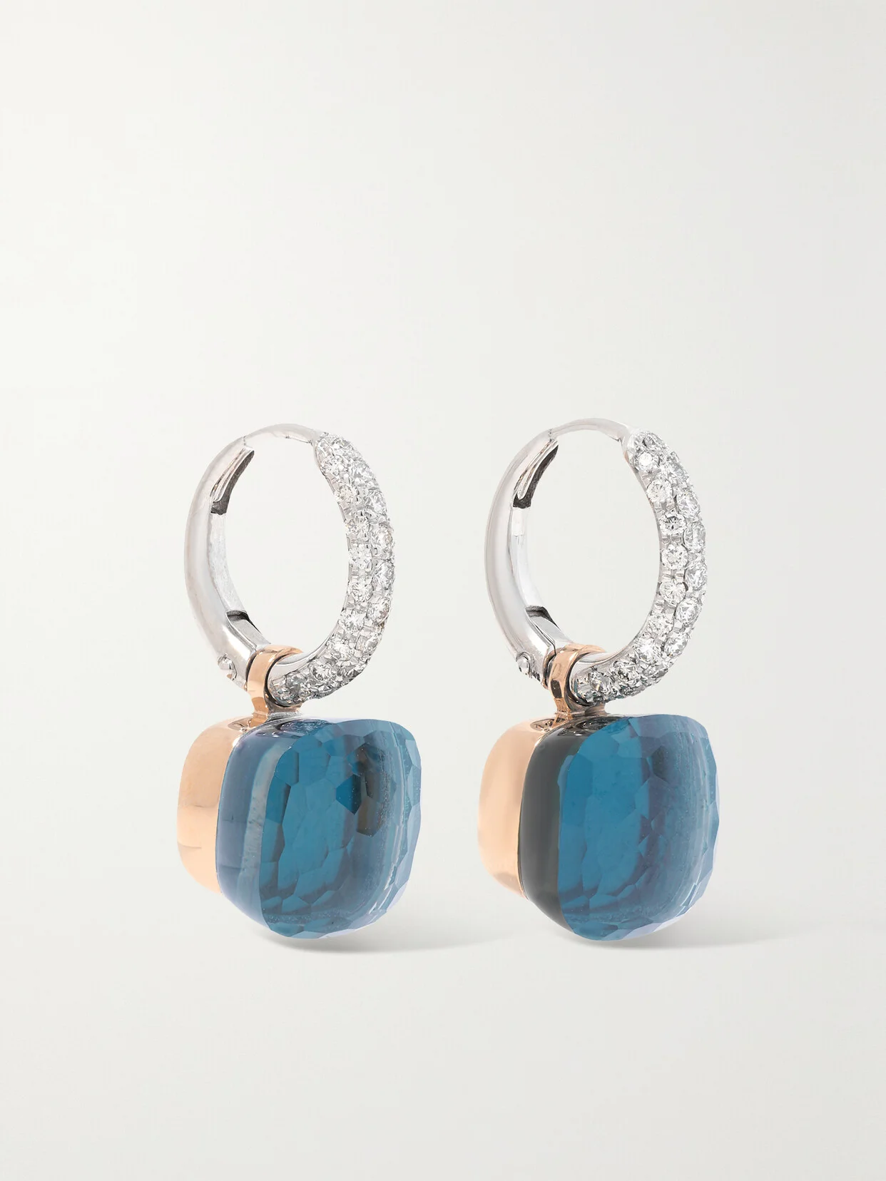 Nestled amongst Milan's historic streets, Pomellato's atelier is home to some of Italy's most skilled jewelers. These 'Nudo' earrings are crafted from 18-karat white and rose gold and strung with London blue topaz and turquoise doublets. Detach the charms if you'd prefer to wear the diamond-encrusted hoops alone.