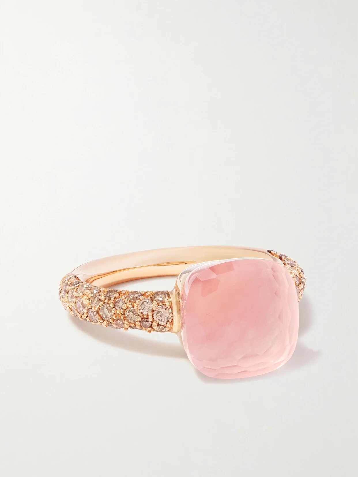 The transformative power of color is at the heart of Pomellato's 'Nudo' collection. Handmade from 18-karat rose gold, this ring features a combination of chalcedony and captivating rose quartz - a stone thought to communicate love, making it the perfect gift. The band is encrusted with 58 shimmering brown diamonds.