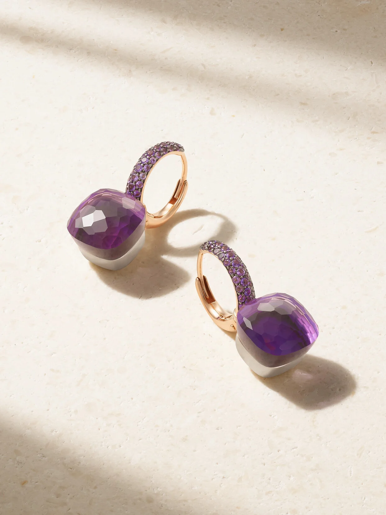 Founded in Milan in 1967, Pomellato embodies the elegant and unconventional beauty of its hometown. These earrings have been handcrafted in-house from rhodium-plated 18-karat rose and white gold and set with deep purple jade and amethyst. Their small size makes them perfect for stacking.