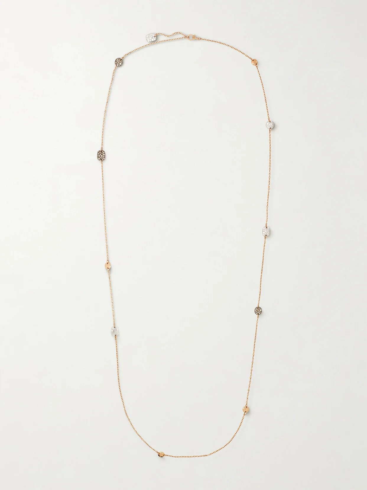 From Pomellato's 'Sabbia' collection, this necklace is inspired by natural beauty and designed to resemble the glimmer of sand as the sun hits it. It's been hand-cast in Italy from 18-karat rose gold and threaded with contrasts of pave, brown and blackened diamonds. The play of different-sized links is an unconventional signature of the brand.