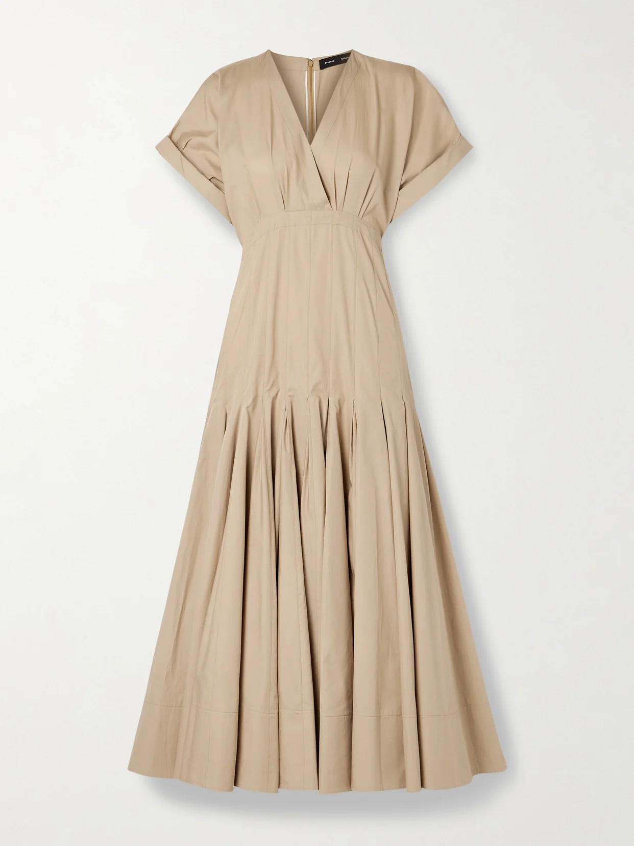 Proenza Schouler is so skilled at creating refined, minimal designs with a directional edge. Made from cotton-blend poplin, this 'Ciara' midi dress has a wrap-effect top complete with wide, rolled cuffs. It fits slim through the hips before flaring out to a pleated hem that moves beautifully as you walk.