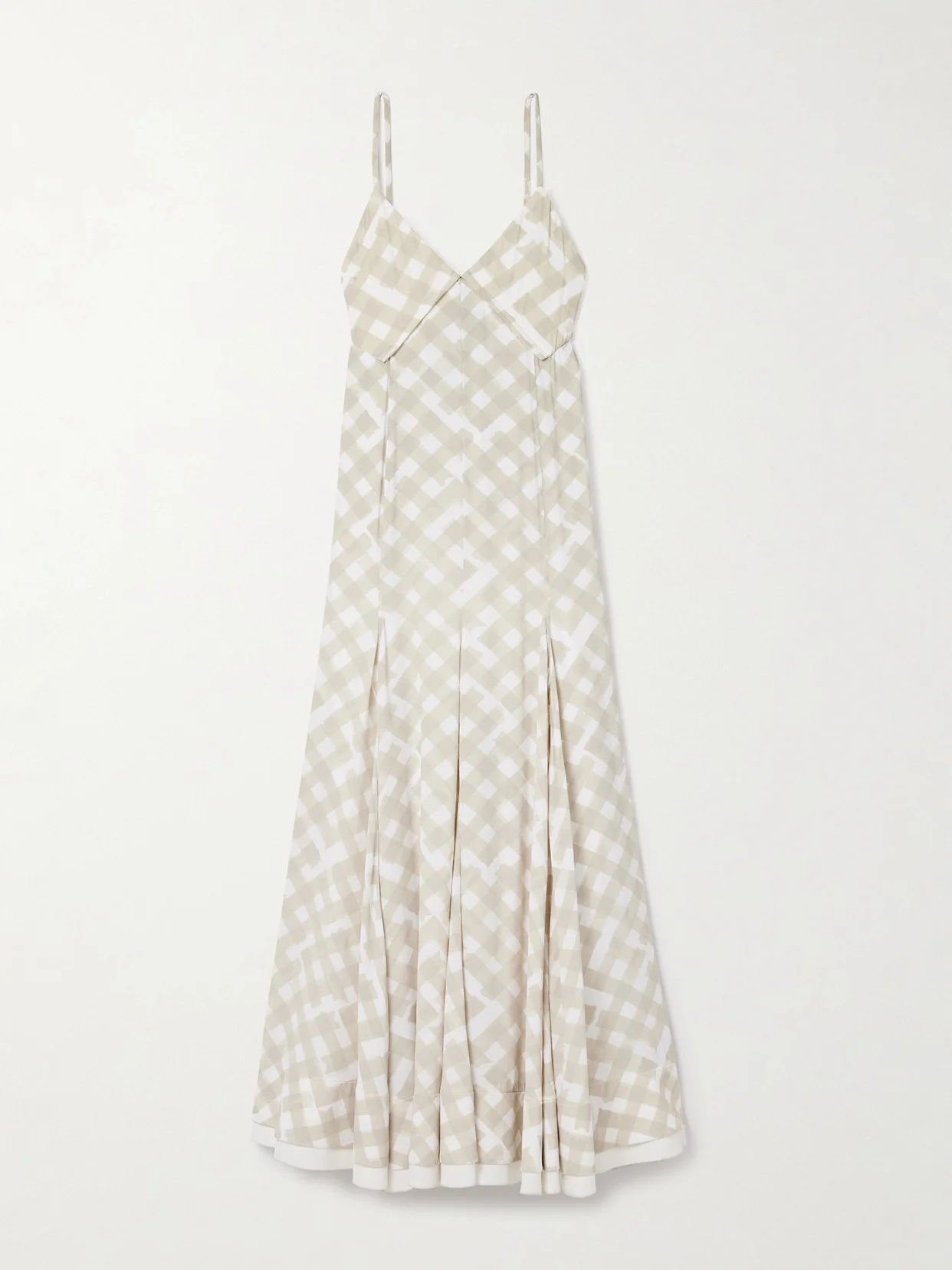 Proenza Schouler's 'June' dress features soft 'Oyster' checks that look as if they've been painted on with watercolors. It's made from fluid crepe de chine and has a layered bust and slim straps that frame the low-cut back. The godet pleats offer beautiful movement as you walk. Style yours with neutral accessories.