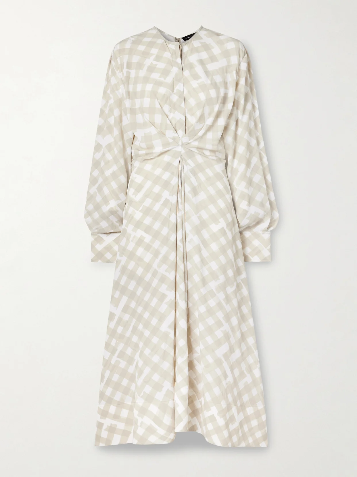 Proenza Schouler plays with shape, fluidity and the thoughtful tension between control and ease. This 'Keria' dress is made from crepe de chine patterned with neutral checks and has a gathered waist and inverted front pleat that creates soft volume through the midi skirt.