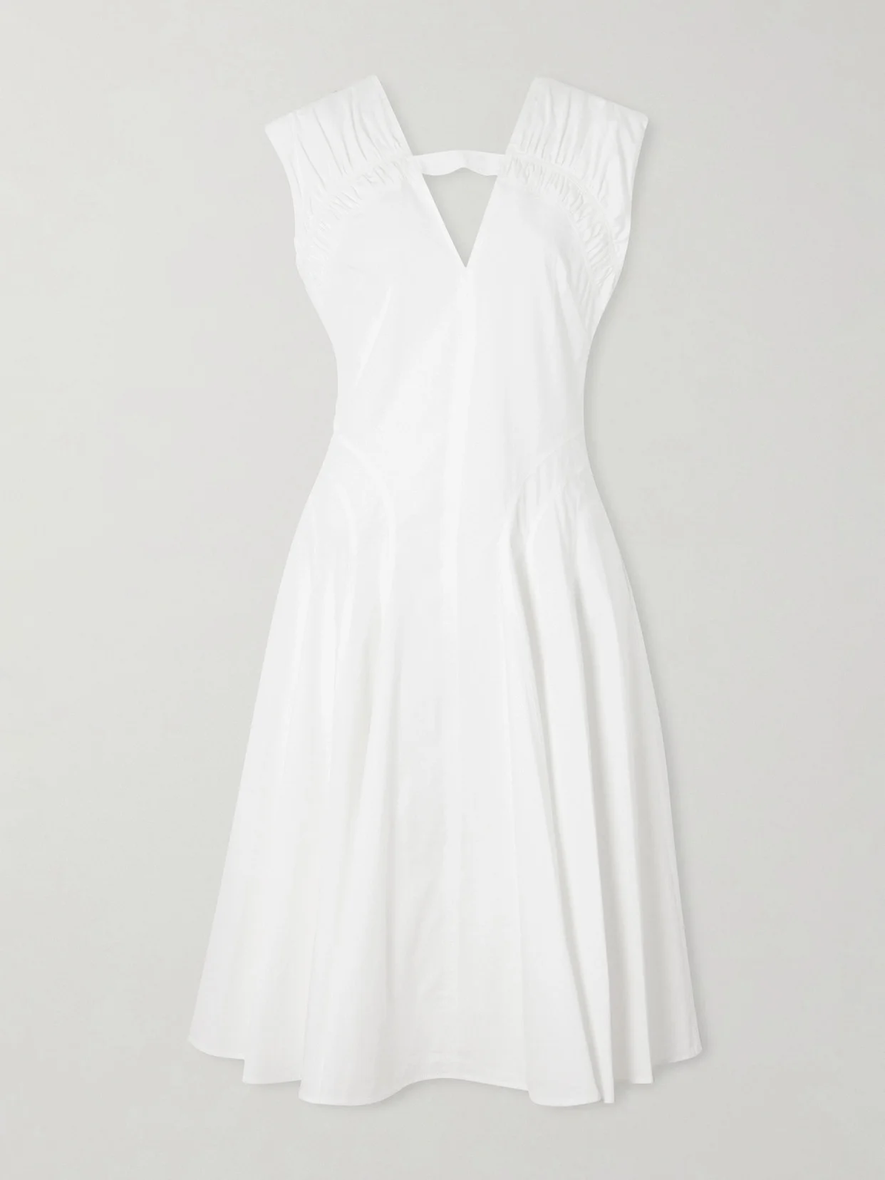Proenza Schouler is renowned for its contemporary New York aesthetic. Cut from cotton-blend poplin, this 'Manoela' dress has a fluid skirt that contrasts with the sharp structure of the cutout V-neckline. The ruching across the shoulders adds shape, while the pockets are a practical finishing touch.