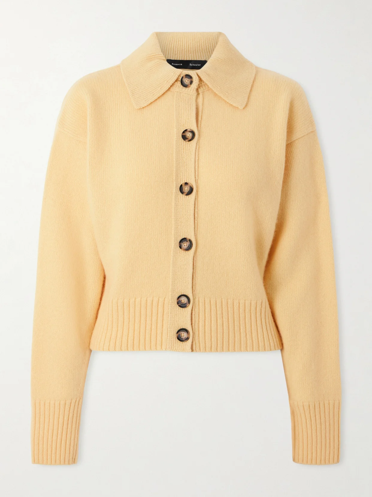 Proenza Schouler knits its 'Rocio' cardigan from softest cashmere-blend that you'll cherish every time you wear it. It's finished with an exaggerated collar, ribbed trims and a row of glossy buttons. Make the pastel-yellow color the focal point of your outfit.