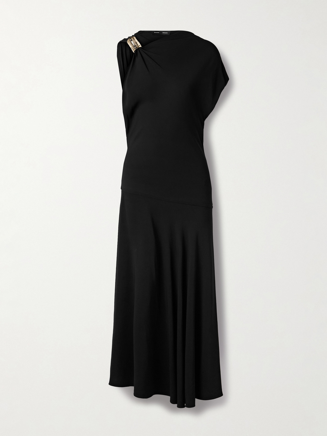 Proenza Schouler's 'Rue' dress is adorned with a gleaming gold-tone embellishment that contrasts the flowy single sleeve. It's cut from black crepe and falls to an asymmetric skirt.
